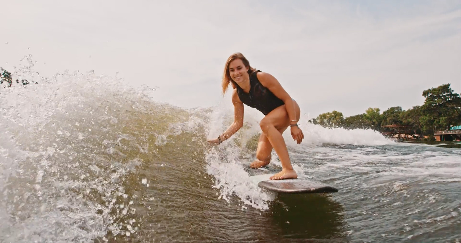 Surfing without an ocean? On the lakes of Texas, pro wakesurfer Morgan Lohmeier shreds an endless wave behind a boat.