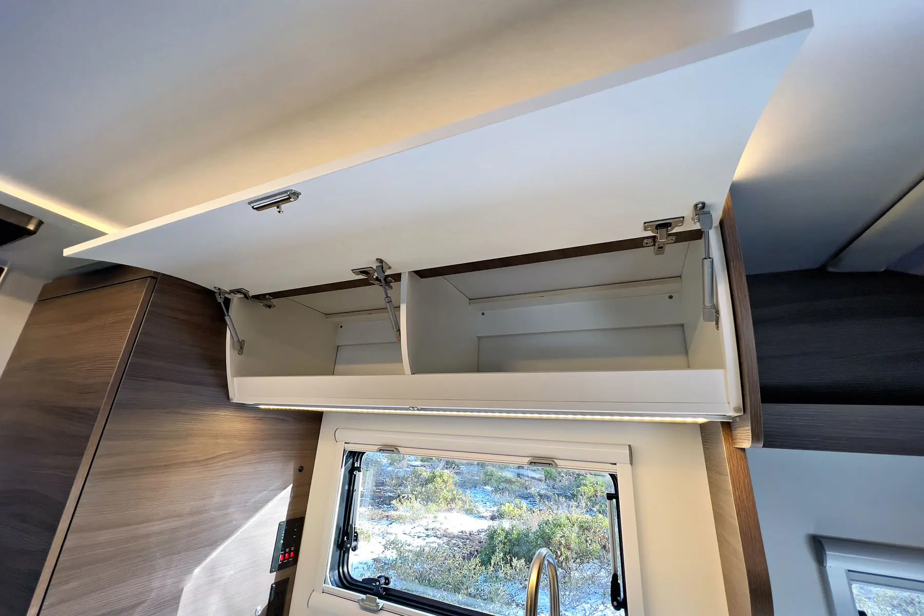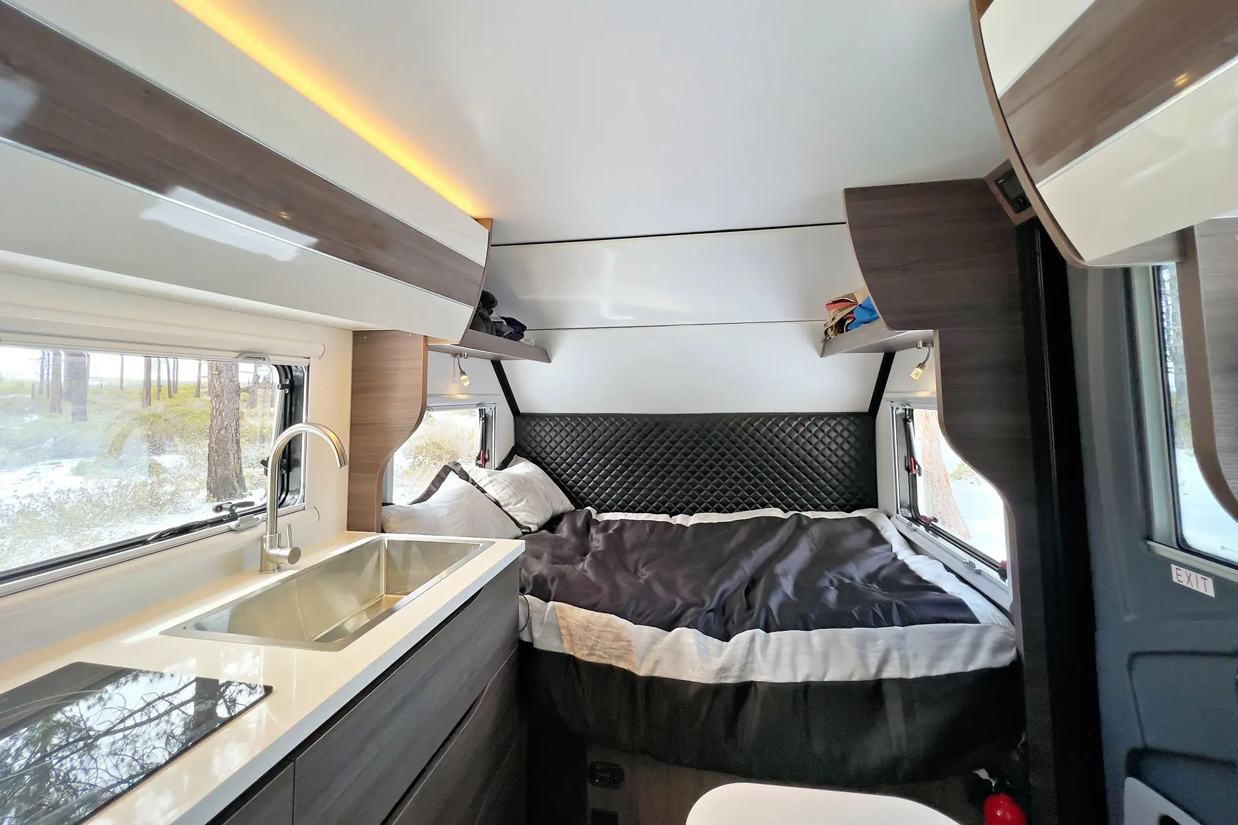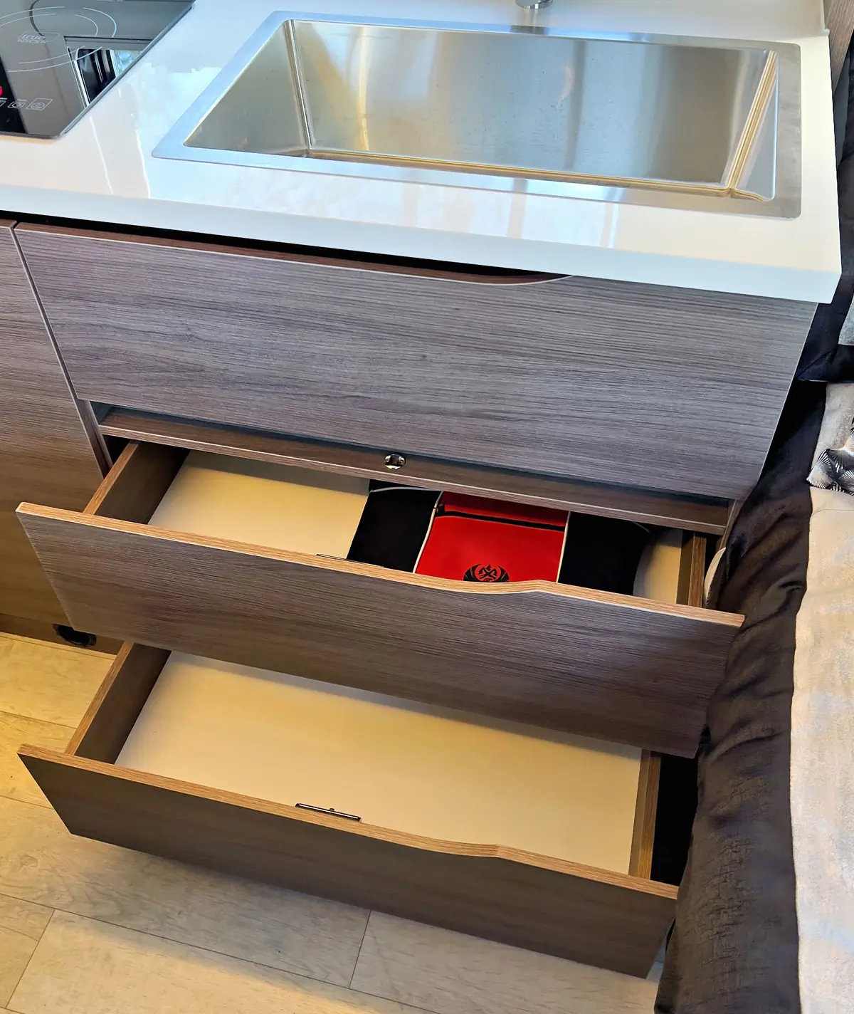 The X145 also has big drawers beneath the big, deep stainless sink, and a pull-out storage area for cookware beneath the True single-burner induction cooktop. There’s also another cabinet above the 12V fridge located to the left of the galley that serves as a roomy pantry.