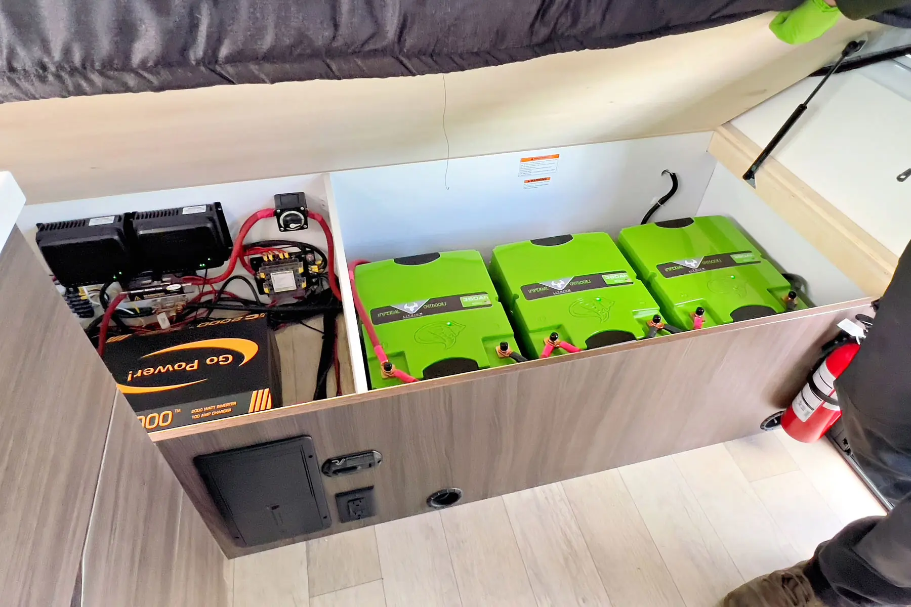 One of the many features of the XploreRV X145 that we liked a lot was the camper’s healthy 12V GoPower solar and Expion360 LifeP04 lithium-ion battery system. This model particular trailer was outfitted with the optional three-battery (1,080aH) package and Stage 3 (740W) solar roof panel kit.