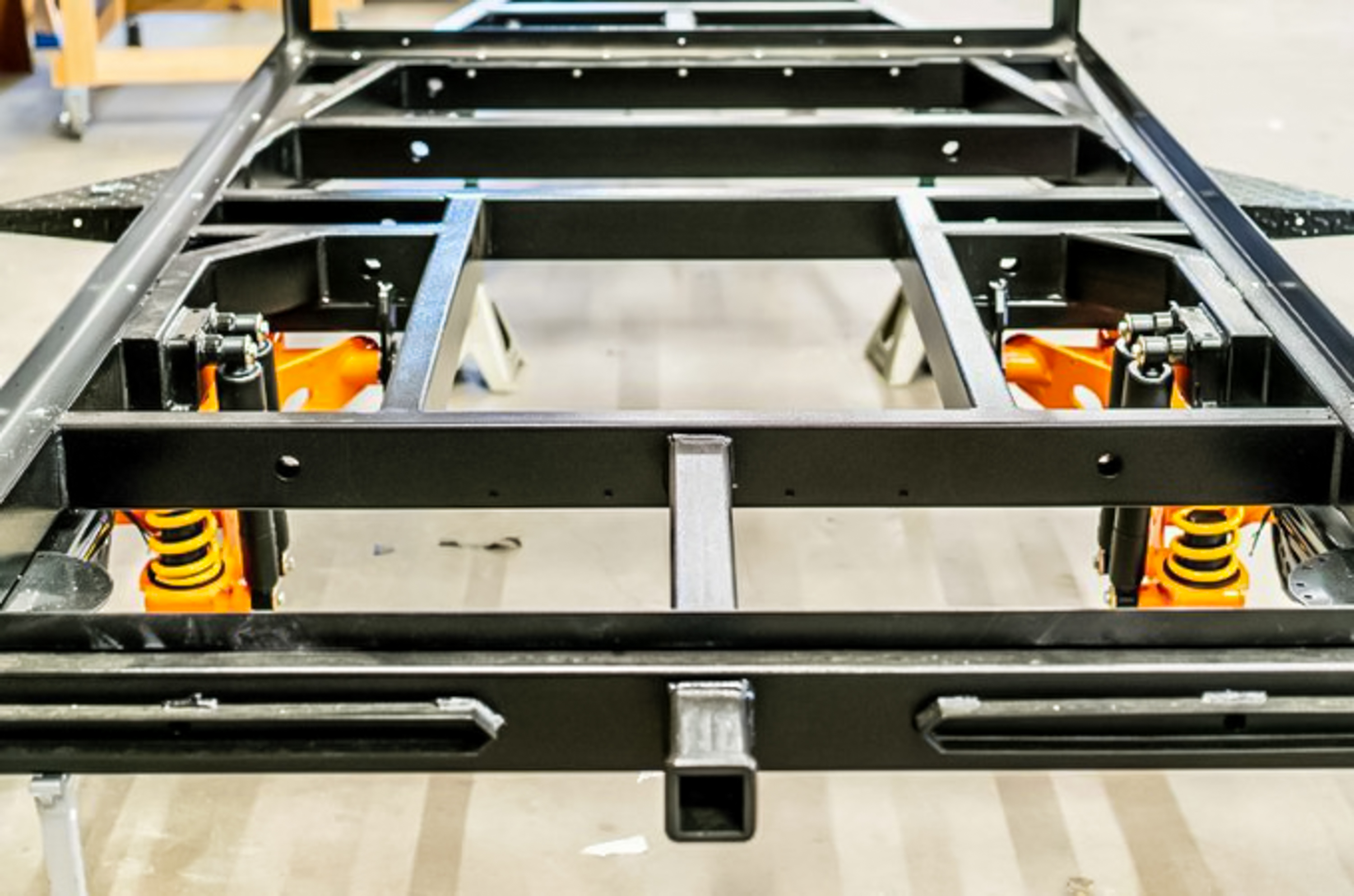 Front and rear 2-inch receiver hitches, a seven-pin trailer wiring harness, a main chassis electrical harness, taillights, and red and orange marker lights are also part of the standard equipment package on the Boreas Chassis. The options list could add fenders, spare tire and mount, a toolbox, rear leveling jacks, and a 30-gallon freshwater tank to your Boreas Chassis order. But, the rest of the trailer build is up to your imagination.