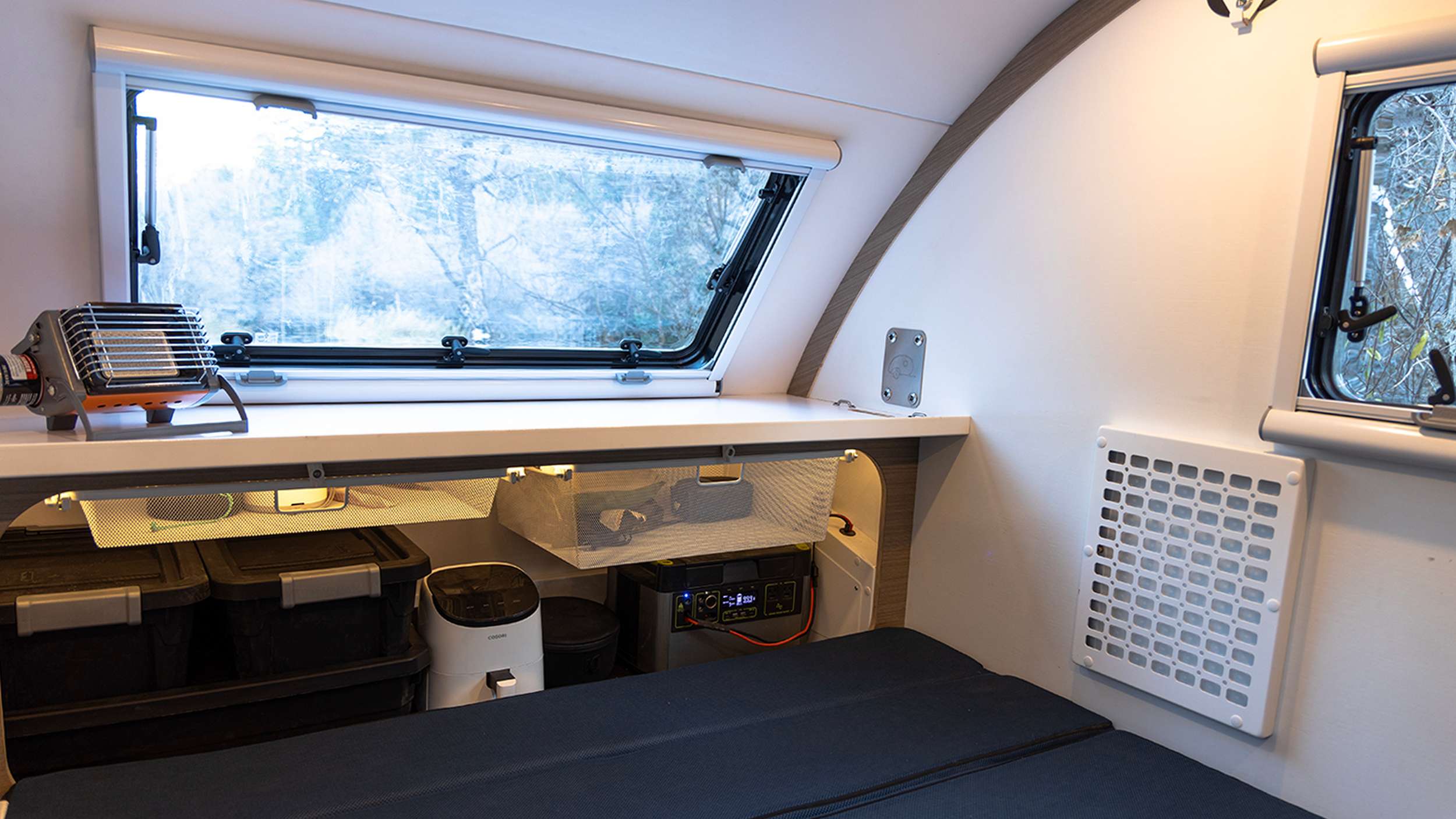 Campers can add equipment back on if they want some of the comfort features back. The options start with the two kitchens — which include a hanging kitchen organizer — and keep going. You can opt for a large driver’s side window or a smaller window and door on that side. Spare tire mounts, jacks, solar panels, fans, and many other features are offered.
