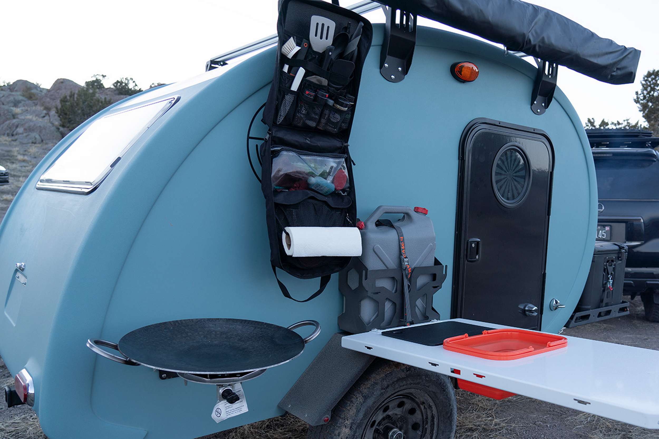 Bean has also improved its front storage system. The twin-tank propane storage holders offer quick and easy tank release to bring your fuel to your kitchen. The rack itself gets more slots to accept J-hook mounting points that improve storage flexibility. Bean will also sell you an Iceco fridge designed to sit outside on the rack.