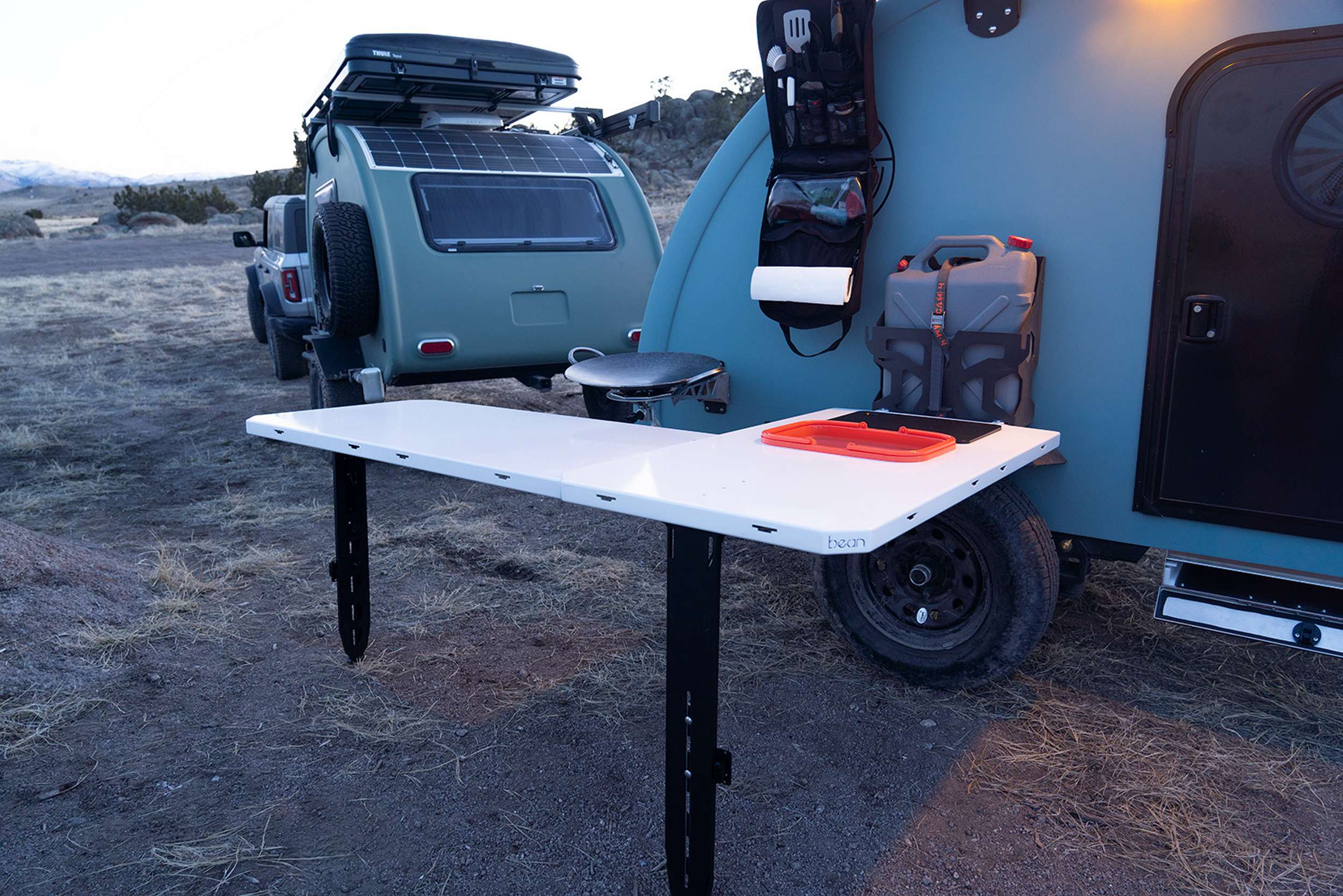 For the Bean Squared, the company developed a detachable outside table for cooking. On the Bean Stock 2.0, you get two options for this table. The first attaches a table under the body. The table hooks into the standard 6-gallon water can holder and has cutouts for a cutting board and a collapsible sink.