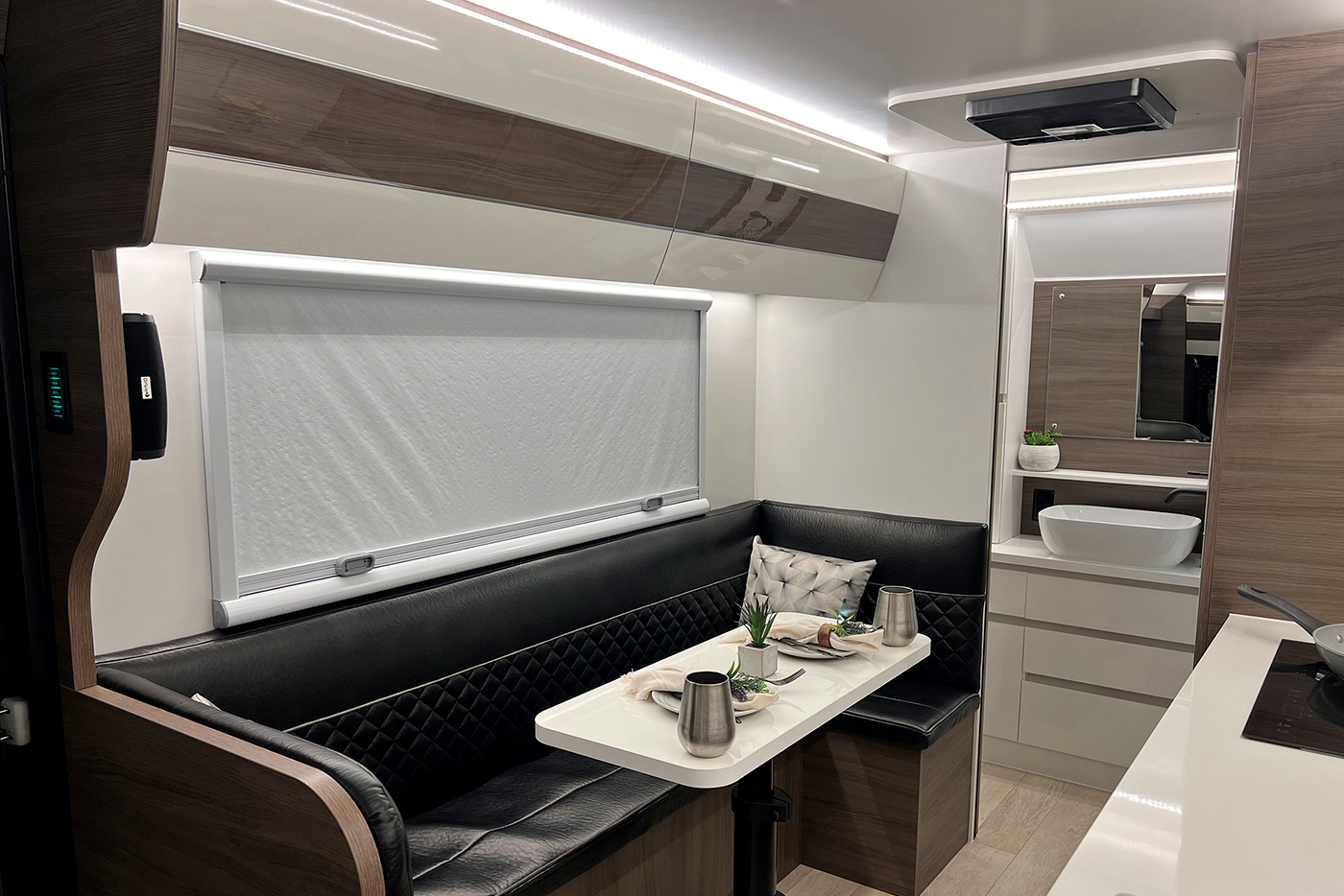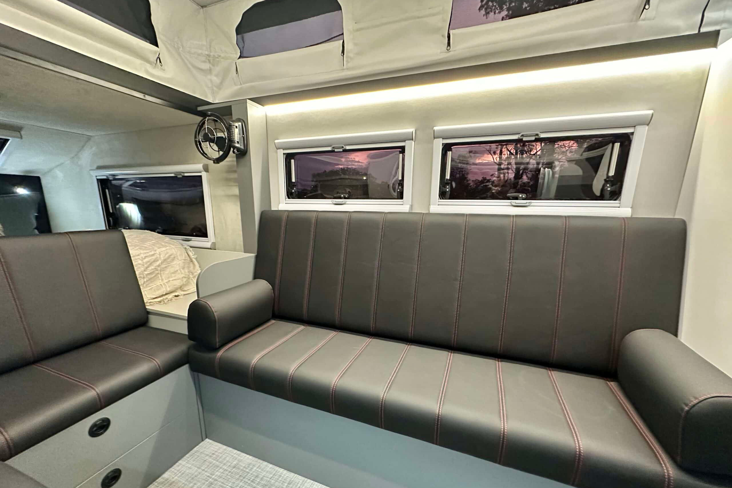The two-way kitchen can be accessed from the inside or outside, and it comes with a portable induction cooktop and room for a larger portable gas BBQ. A 57L outdoor and 136L inside fridge make extended adventures easy to manage.