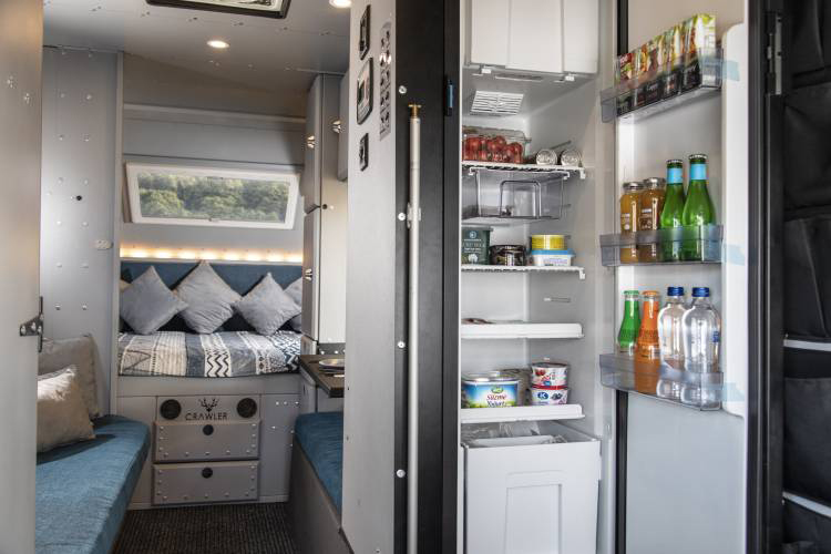 When it comes to interior comfort amenities, the Crawler BATU 535 trailer hits a homerun. A combination furnace supplies hot water and space heating, the master bedroom is spacious, a large 65L refrigerator can hold a shopping cartload of food, and a powerful air conditioning system keeps occupants cool. The master bedroom includes a sliding door with a flyscreen and curtain.
