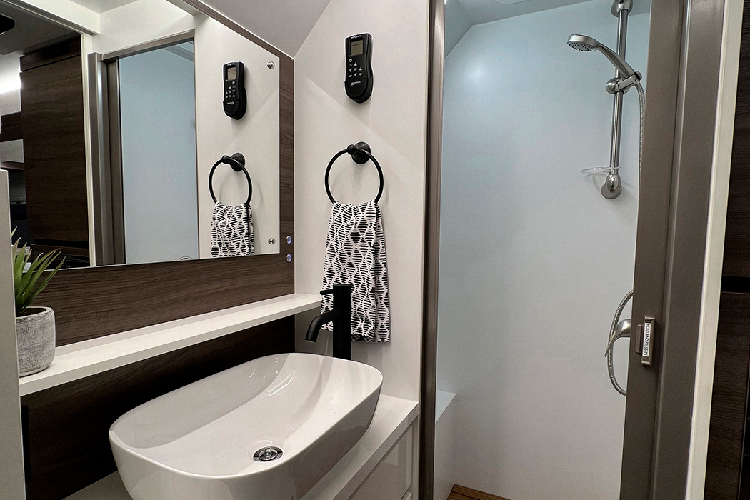 Both EXP-7 models offer the critical components needed for a comfortable and convenient living space. A large couch, fold-up seat, lounge, and master bed can sleep up to six people. Charging outlets and wireless connectivity can be found aside the master bed. The interior bathroom is easily accessed and features a toilet, wash basin, shower, and storage space.