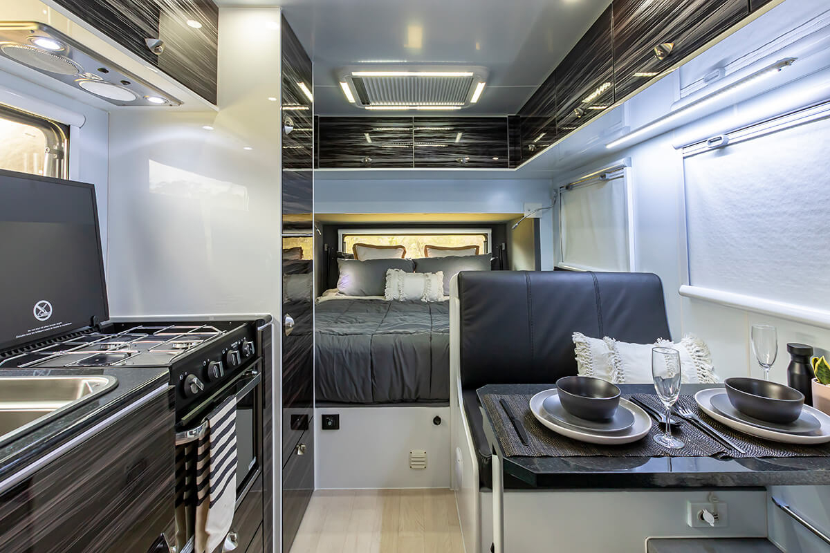 With the top popped up, the Arkto G12 offers standing room and can sleep four persons on its residential-size queen bed, large bench, and single seat/bench connection that creates additional sleeping surfaces. Powder-coated aluminum cabinetry totals 25 cubic feet of interior storage space.