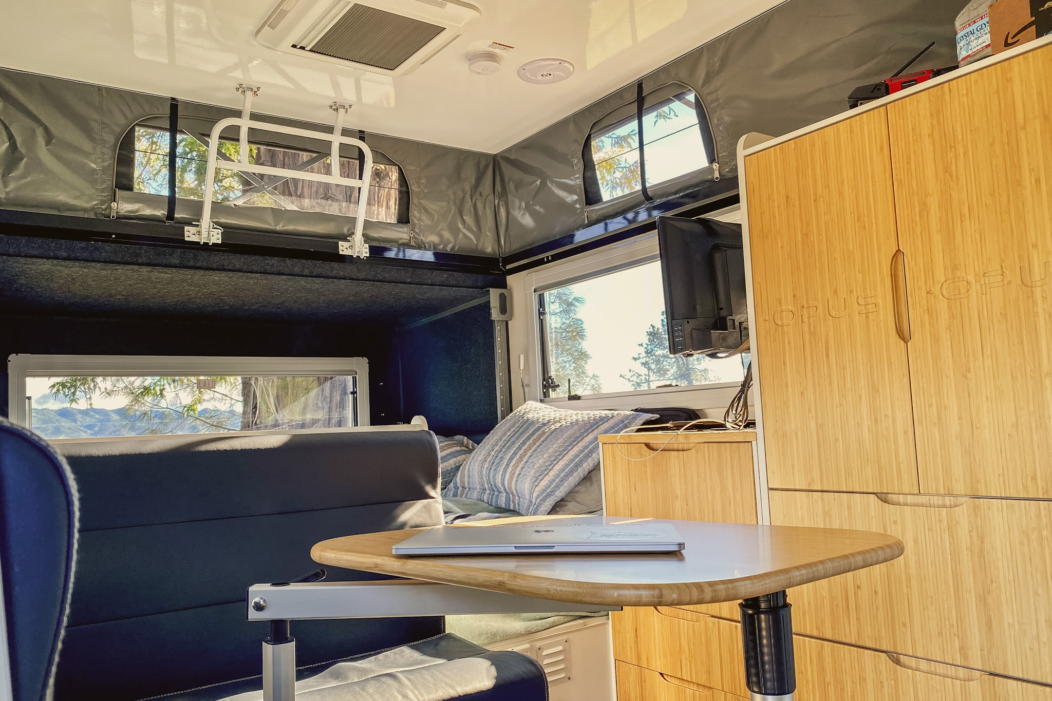 The Opus Camper OP15 trailer is a live-in hard-sided camping trailer with a pop-top that offers full standing room inside and a rear slide-out carrying the king-size bed. All buttoned up, the Opus Camper OP15 offers a low profile for easy towing. Once parked and all opened up, it presents a spacious feel with large windows and a well-thought-out interior layout.