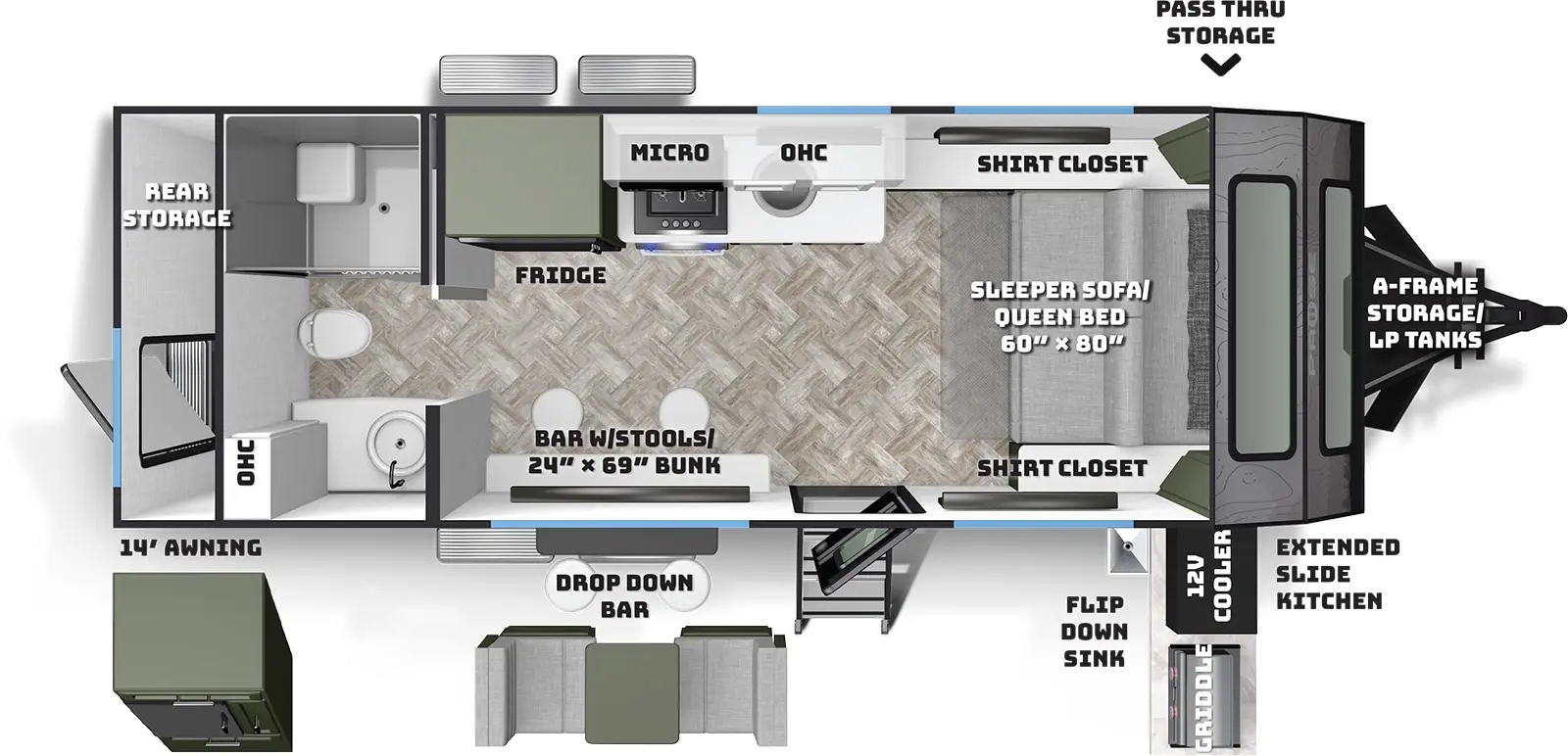 And, during warm summer days, the low-profile high-efficiency 12V roof-mounted air conditioner can cool off occupants in no time at all. A full-size walkaround bed and convertible dinette provide sleeping space for up to four persons. That same dinette can be reconfigured into conversational and mealtime roominess when the sun comes up.