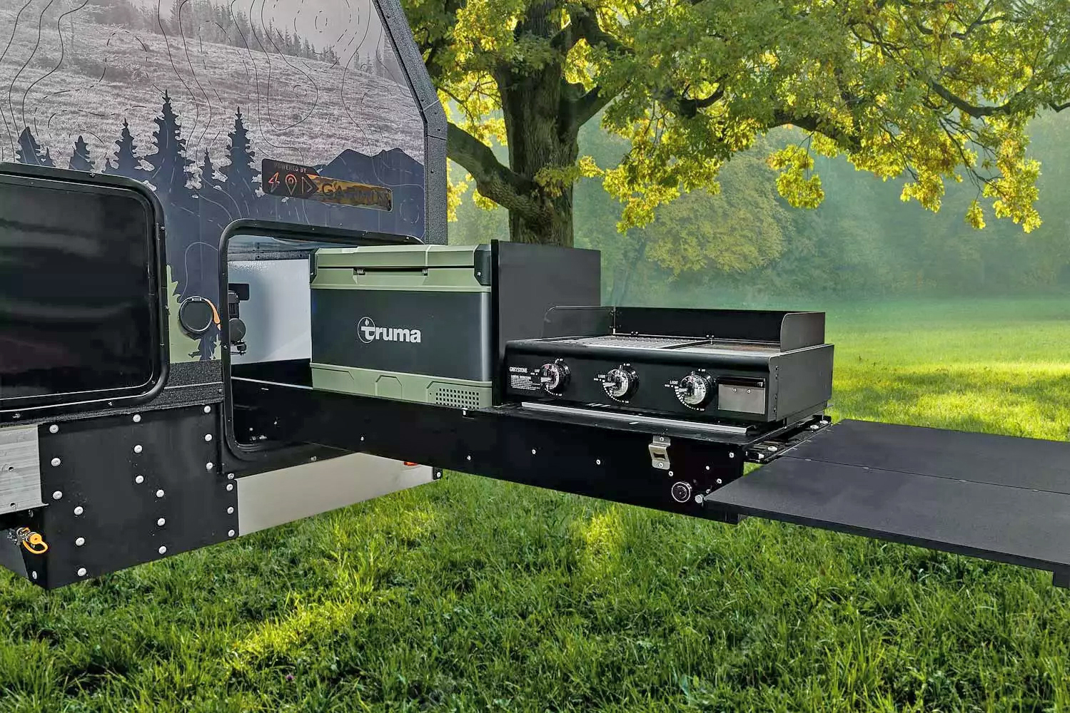 An extended slide-out exterior kitchen makes outdoor cooking a breeze with a 12V dual-zone cooler, combination grill/griddle, collapsible sink, pull-out prep table, and outdoor pantry.