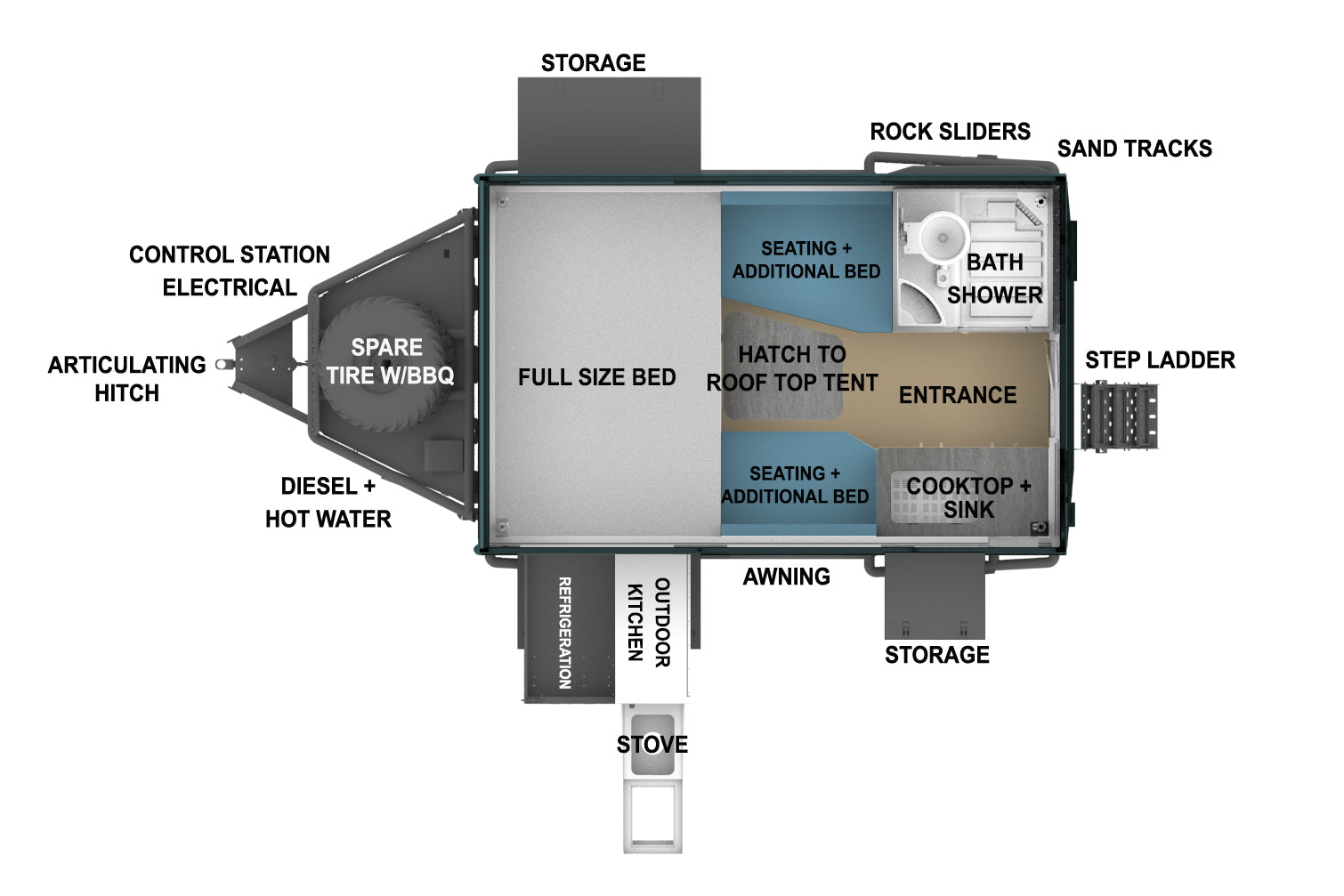 Off-grid adventure in the OPUS Camper OP15 is made easily accessible with standards such as three 100A AGM batteries, a 300W solar panel setup, and utility storage for two 6-gallon fuel cans as standard. You can boost that capability with options such as a DC charger, or lithium batteries and an upgraded charger.