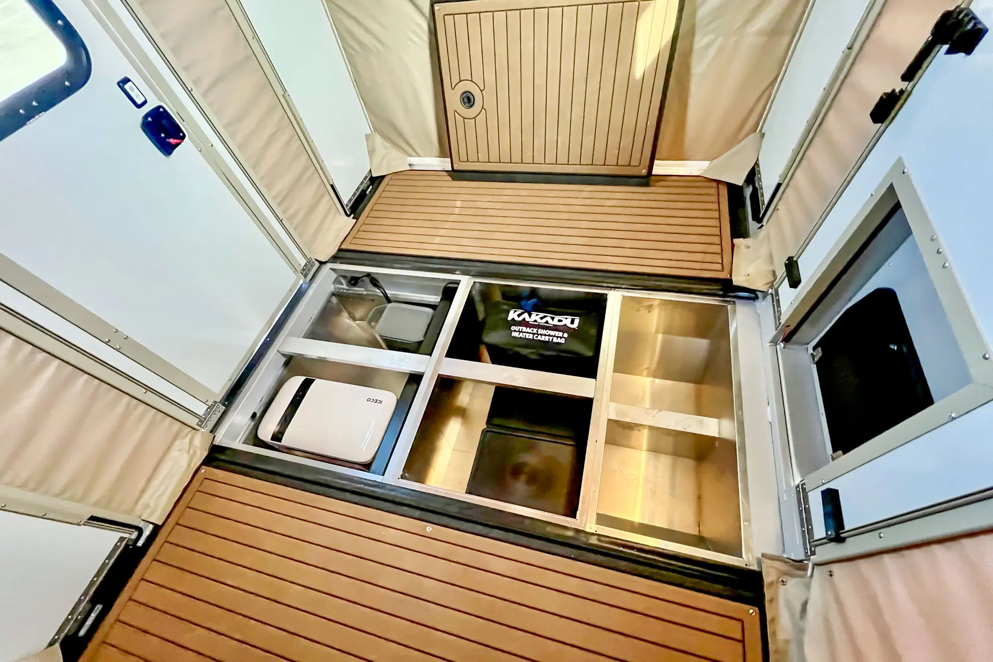 Hot water in this setup comes via a Kakadoo portable shower system, which is battery-powered. Showering can be done outside in a Kakadoo shower tent or inside in a custom setup with folding basin and curtains that hang from the ceiling.