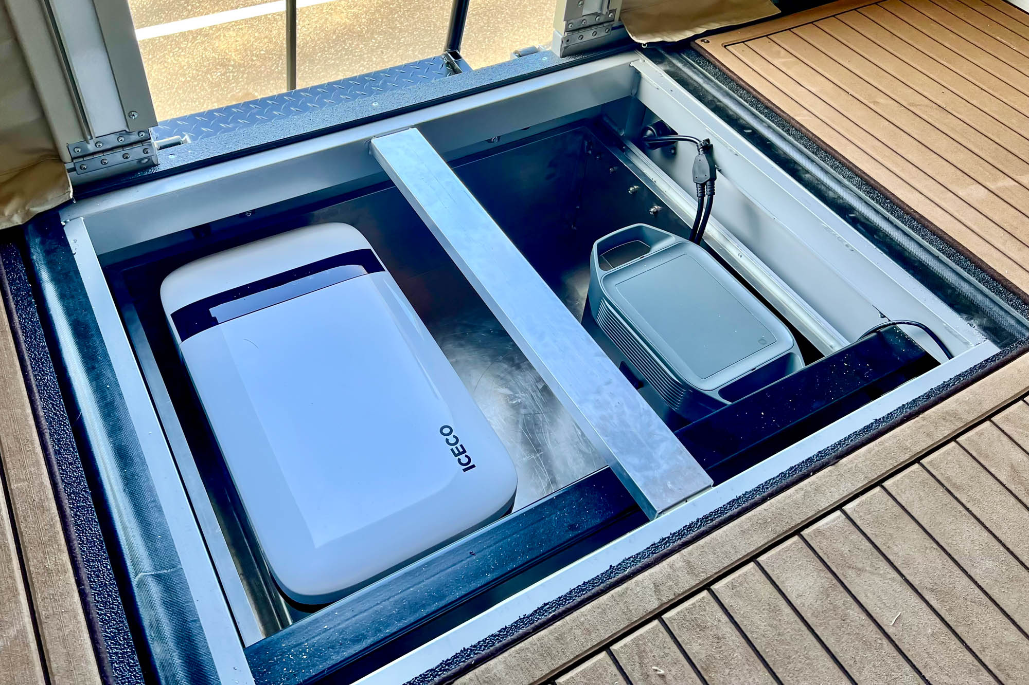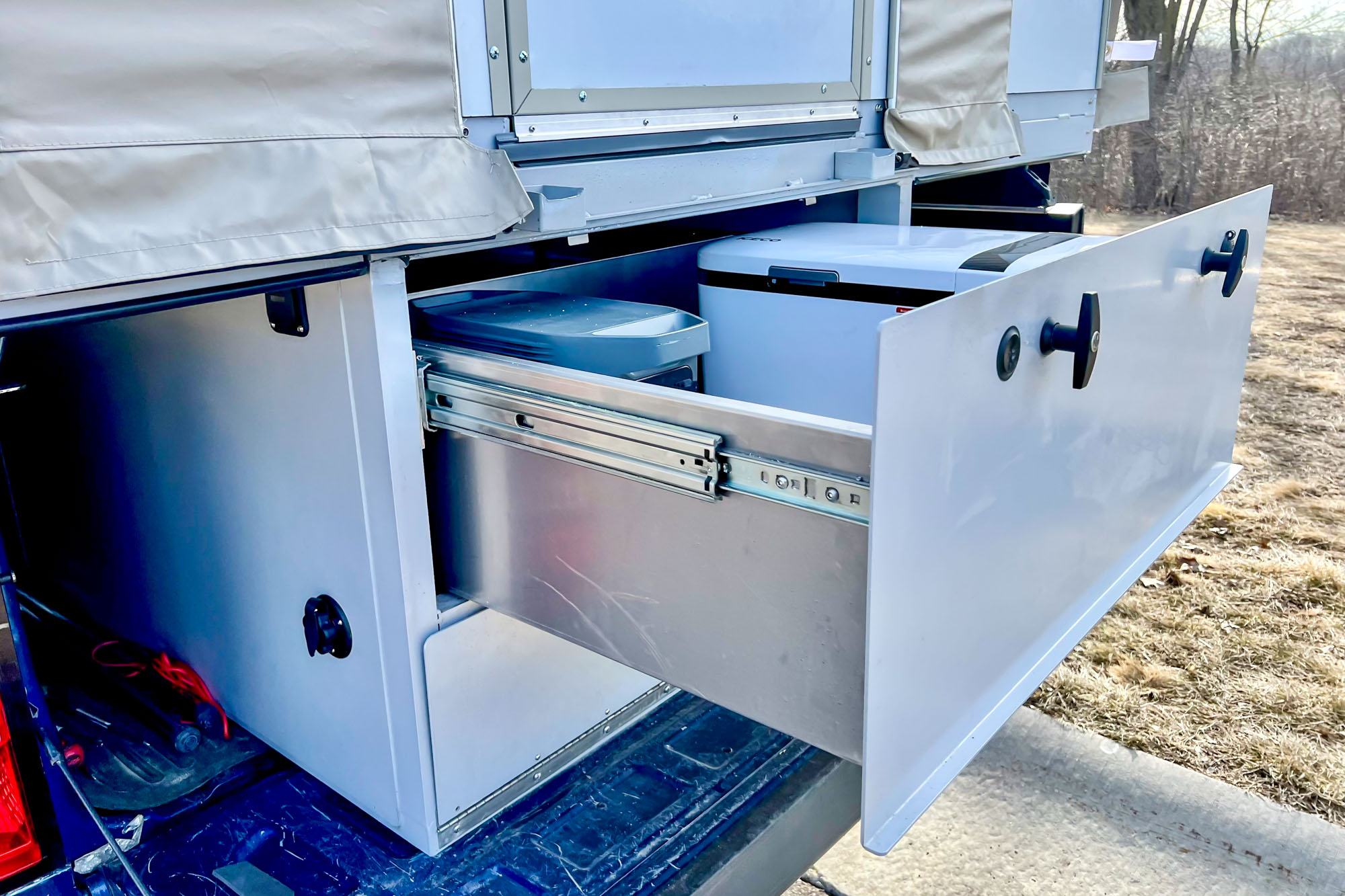 There is a sliding drawer that comes out the rear of the camper, which can be accessed from inside and outside the camper, that can be fitted with up to two 21QT fridge/freezers or a 35QT fridge/freezer.