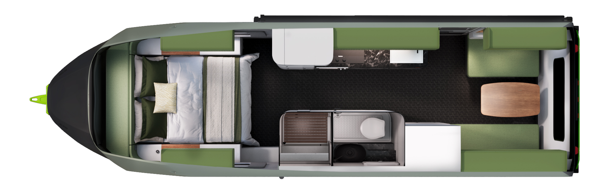 Inside this trailer are all the comforts of home. Think shower, toilet, AC, heat, hot water, and a modern kitchen with a two-burner induction cooktop, convection microwave, and sizable refrigerator. Up front is a bedroom with a queen bed, while the rear dinette converts for additional bedding.