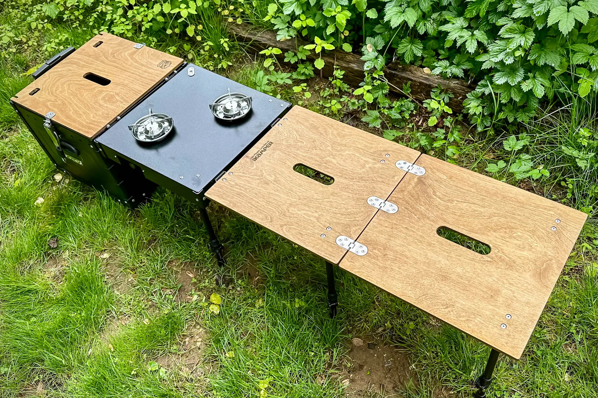 The all-inclusive unit comprises a stovetop with two 7,500-BTU KOVEA burners, three tabletop sections, and a large storage area to carry everything you need to cook, except for the food. The burners can run off of isobutane camping gas or propane.