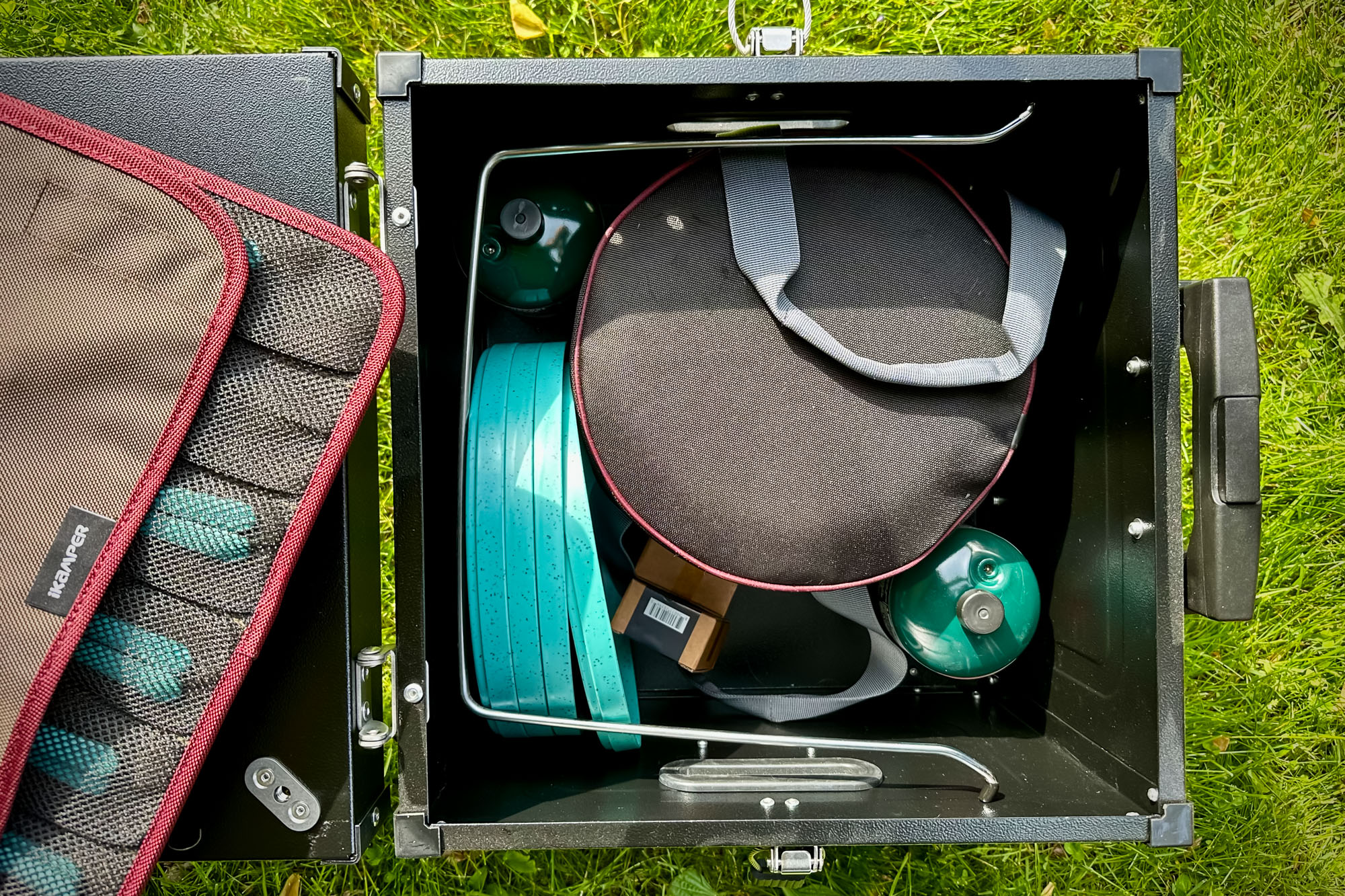 I’ve had the iKamper Aioks for around a year now and am still wildly impressed with its overall size versus the amount of storage inside. Within the box’s cavity, it can store all your pots and pans, plates and bowls, utensils, and two gas canisters. This is in addition to storing the stoves and legs for the tabletop. This is truly a study of innovation and organization.
