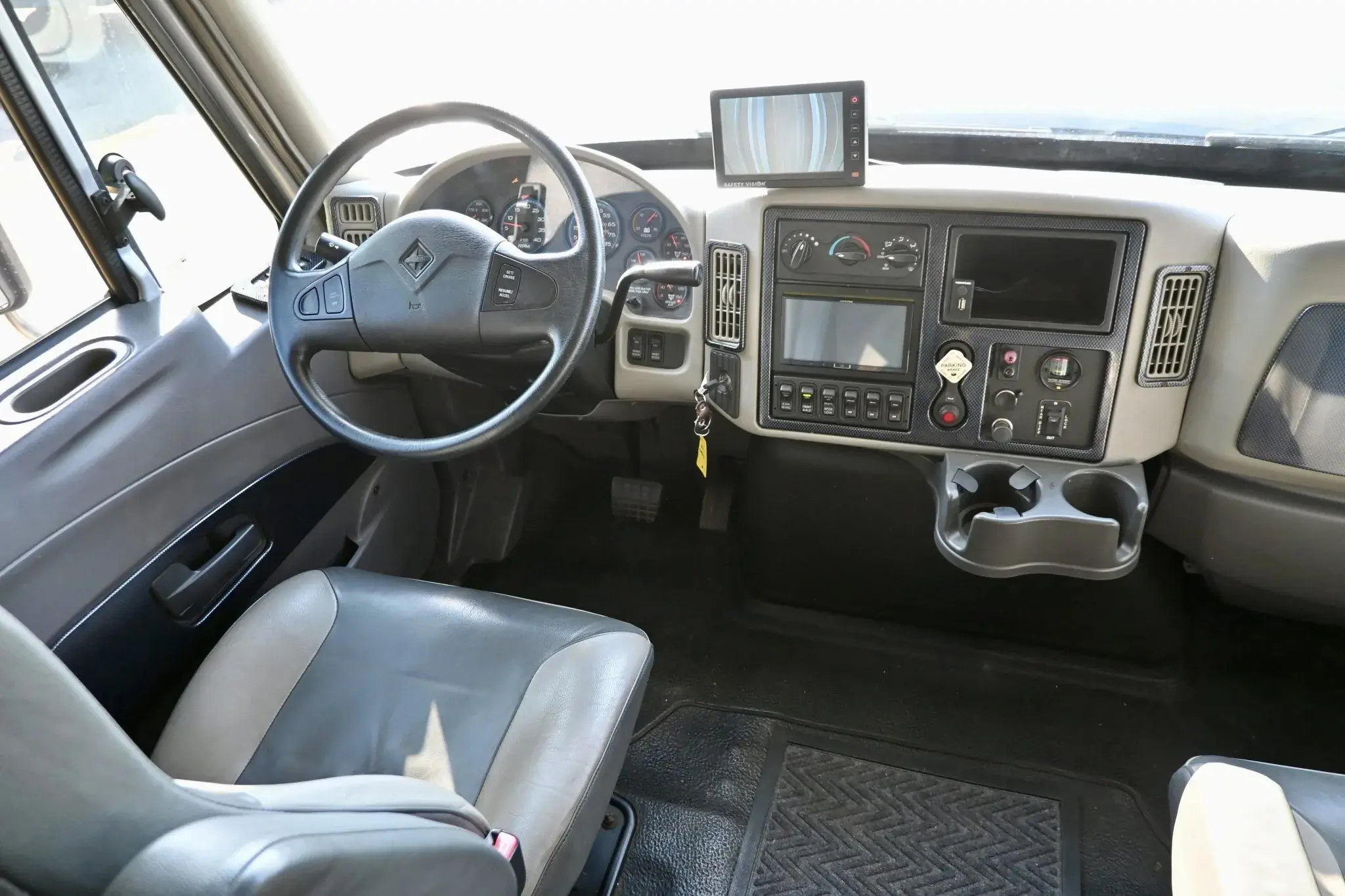 Inside the extended-cab are basic two-tone gray vinyl captain’s chairs. Behind those are small two individual rear seats that flank the pass-through to the camper.