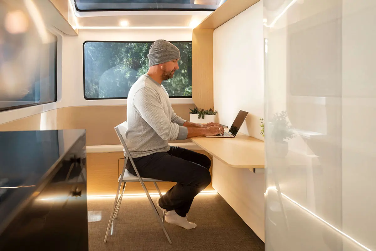 Interior features will be familiar, like two beds that can accommodate four people and a kitchen with a cooktop, microwave, and fridge. It’s also “plug-and-play ready” for Starlink, which allows for internet even on the move.