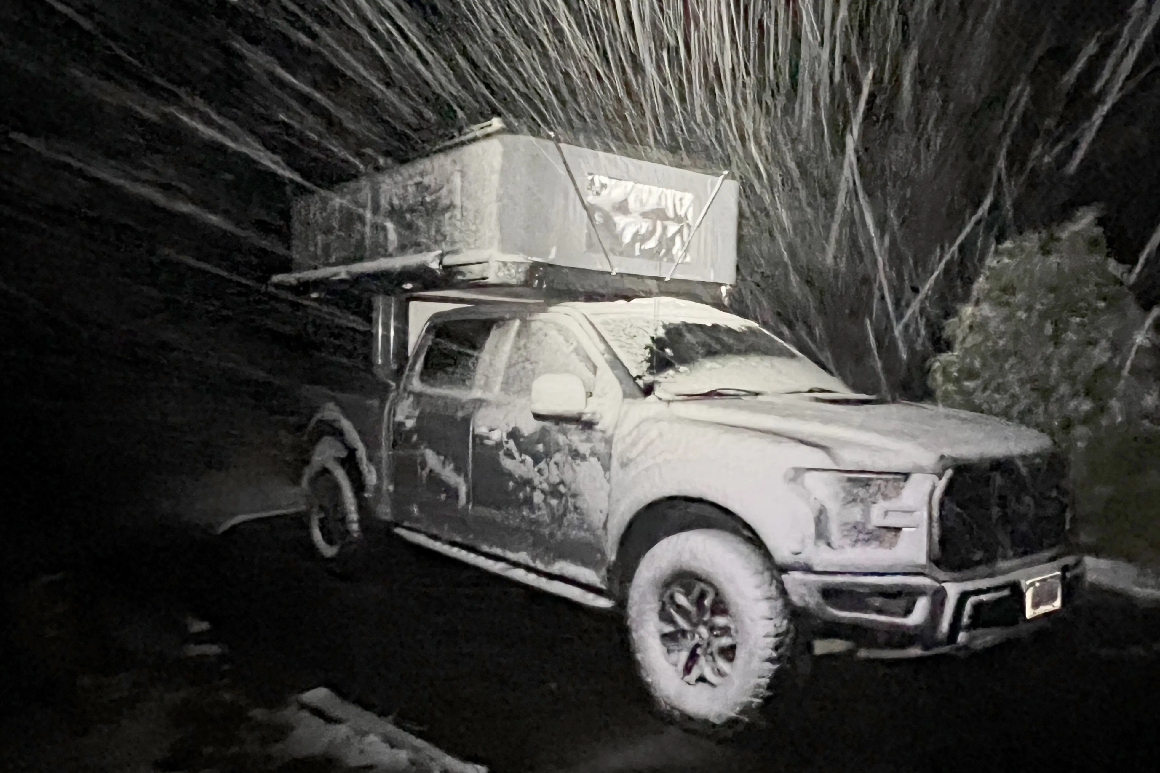 I opened the door and put up my hood against the wintery wind, buffeting the Tune Outdoor M1 camper bolted to the Ford F-150 Raptor demo truck. This would be one legit test.