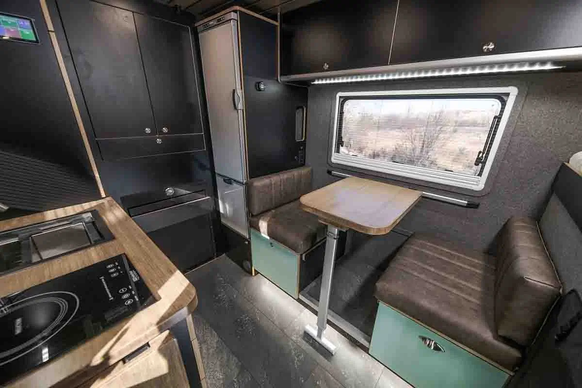 The most noticeable change from the Grid Mini’s larger counterpart is the elimination of the wet bathroom. The Grid Mini opts for a part-time bathroom, featuring a retractable shower with a fabric curtain and floor pan, as well as a concealed pull-out toilet under the dining bench.