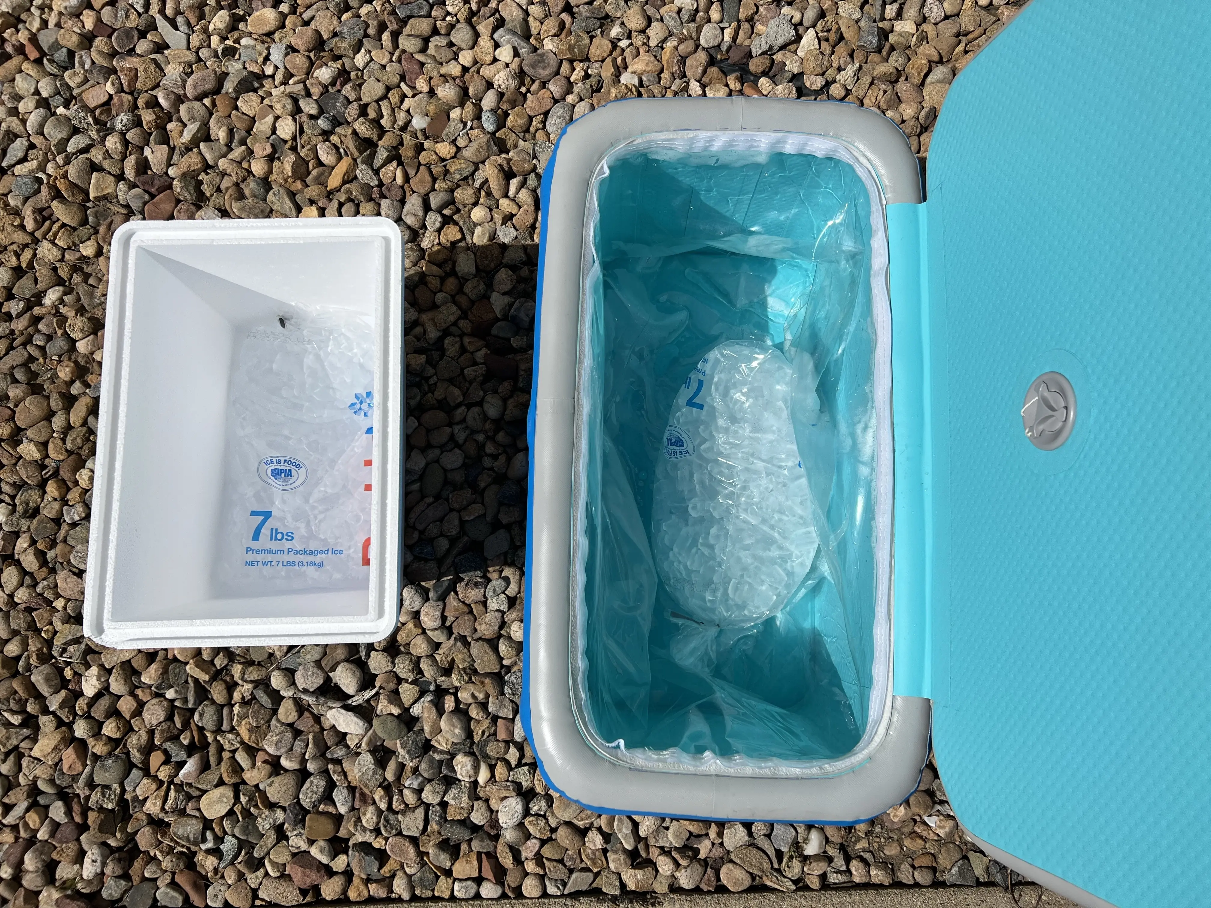 I later tested this in a temperature-controlled environment (my kitchen). I put 7 pounds of ice inside the Airskirts cooler, and 7 more inside a styrofoam gas station cooler. Because realistically, if I hadn’t had the Airskirts’ Inflatable Cooler on me in that parking lot, that’s likely what I would have bought to get me by.