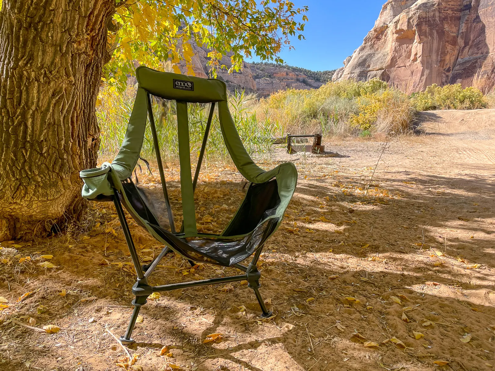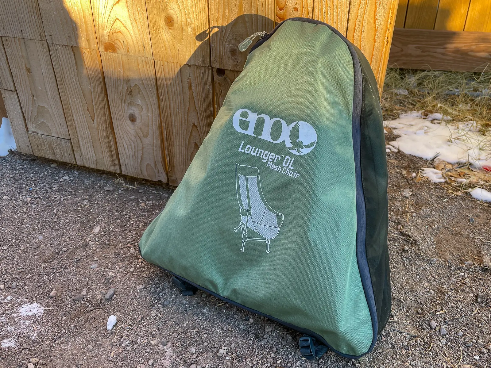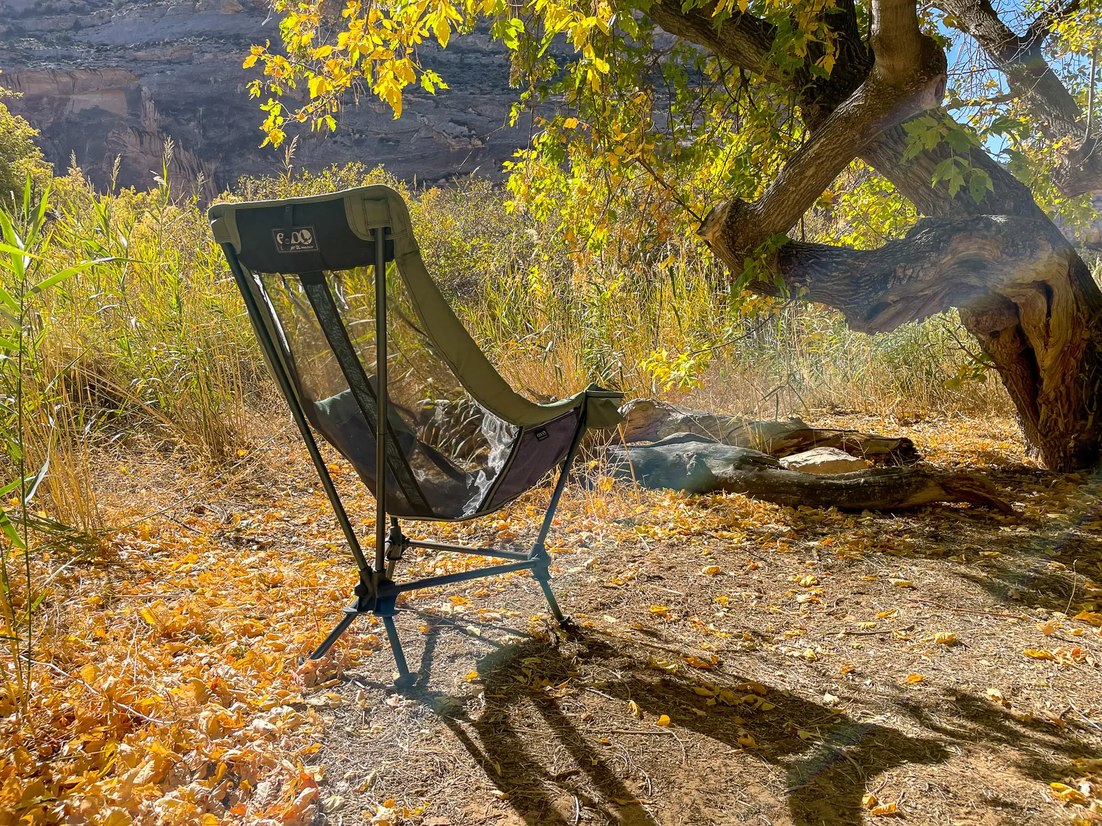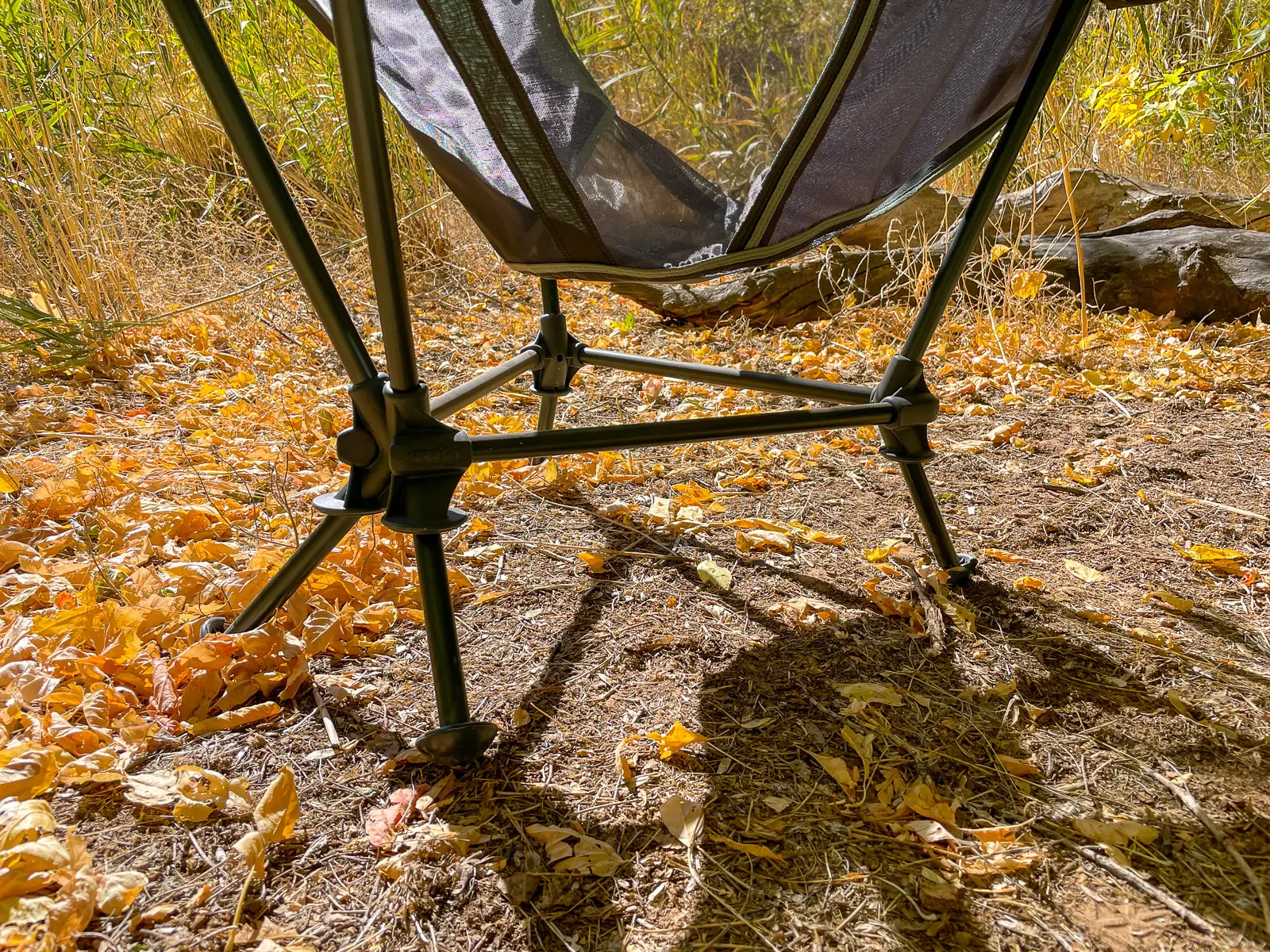 The height from the ground to the bottom of the seat is an often-overlooked yet extremely important consideration. This dictates not only how bent your legs will be but also makes a chair easier or more difficult to get out of. While most chairs don’t offer multiple heights, I will note that the ENO Lounger DL Mesh does — with the choice of deploying either 3- or 10-inch legs.