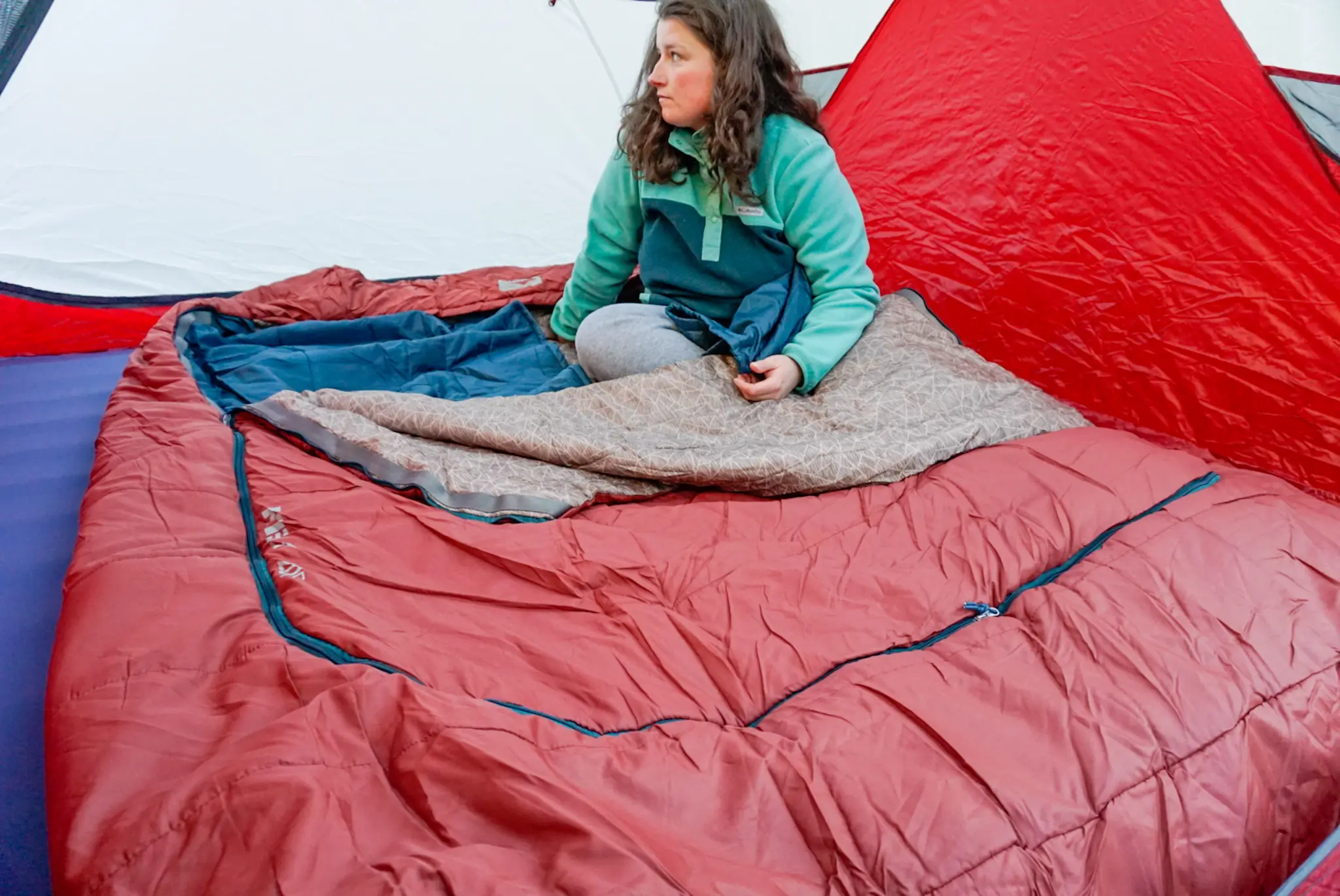 Some camping sleeping bags listed in this guide have sewn-in blankets that help retain heat and insulation within the bag itself. Similar to standalone liners, they can also make the sleeping experience much more comfortable due to that nice next-to-skin feel. We particularly enjoyed the flannel blanket on the Kelty Wayback, and the dual blankets on the Kelty Tru.Comfort Doublewide means we don’t have to fight over the covers.