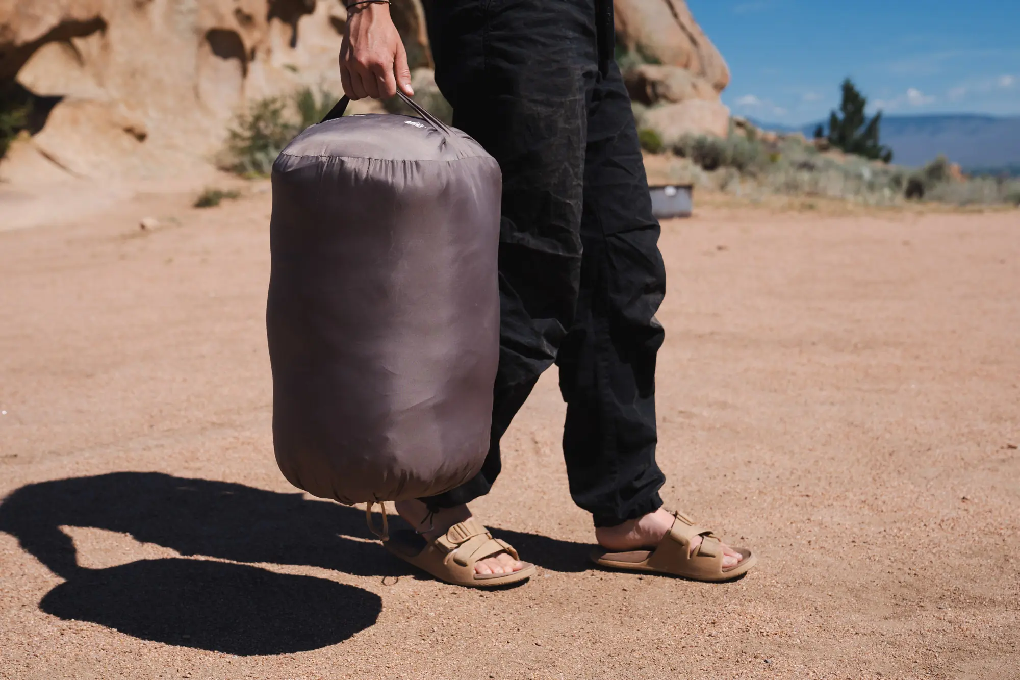 More comfort-oriented bags with wider cuts won’t compress as well, and may even opt to forego the compression stuff sack entirely. The NEMO Jazz 30 travels in a spacious duffel-bag-like sack, and bags like the Kelty Wayback will roll up into themselves and secure with attached compression straps.