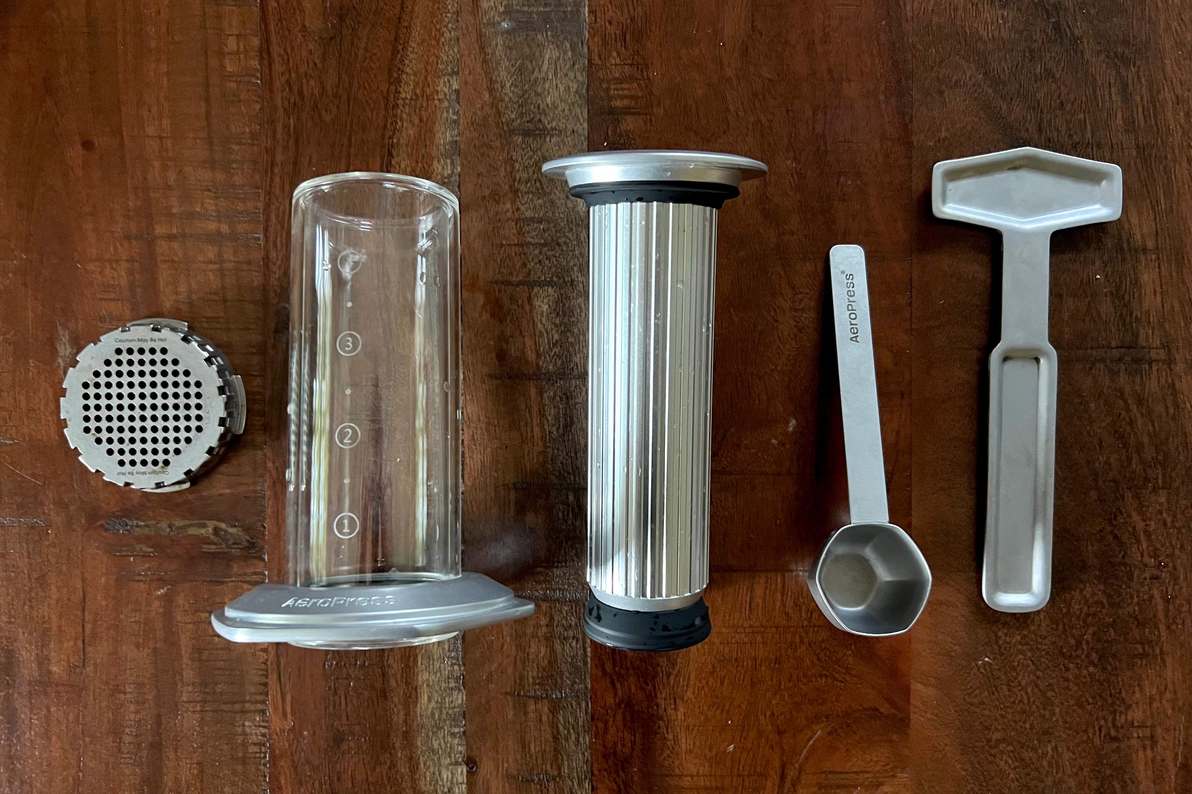 The design has just three main components: the plunger, the chamber, and the filter cap. It also comes with a measuring scoop and stirrer. Simply load an AeroPress filter in the cap, attach it to the chamber, and drop one scoop of coffee into it. Boil water, pour it over the coffee, insert the plunger, and press down. Pressure forces the coffee through the filter into your mug.
