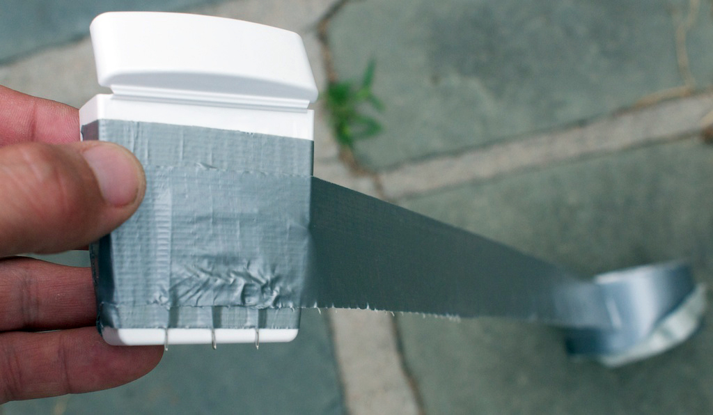 Cut the duct tape to make it about half to 3/4 width and start wrapping. The narrower tape should lay reasonably flat on the not-quite-square container. Don’t worry about a few bubbles. If you press it all out at the end, it doesn’t seem to hurt the tape much even after a year or more of carry.