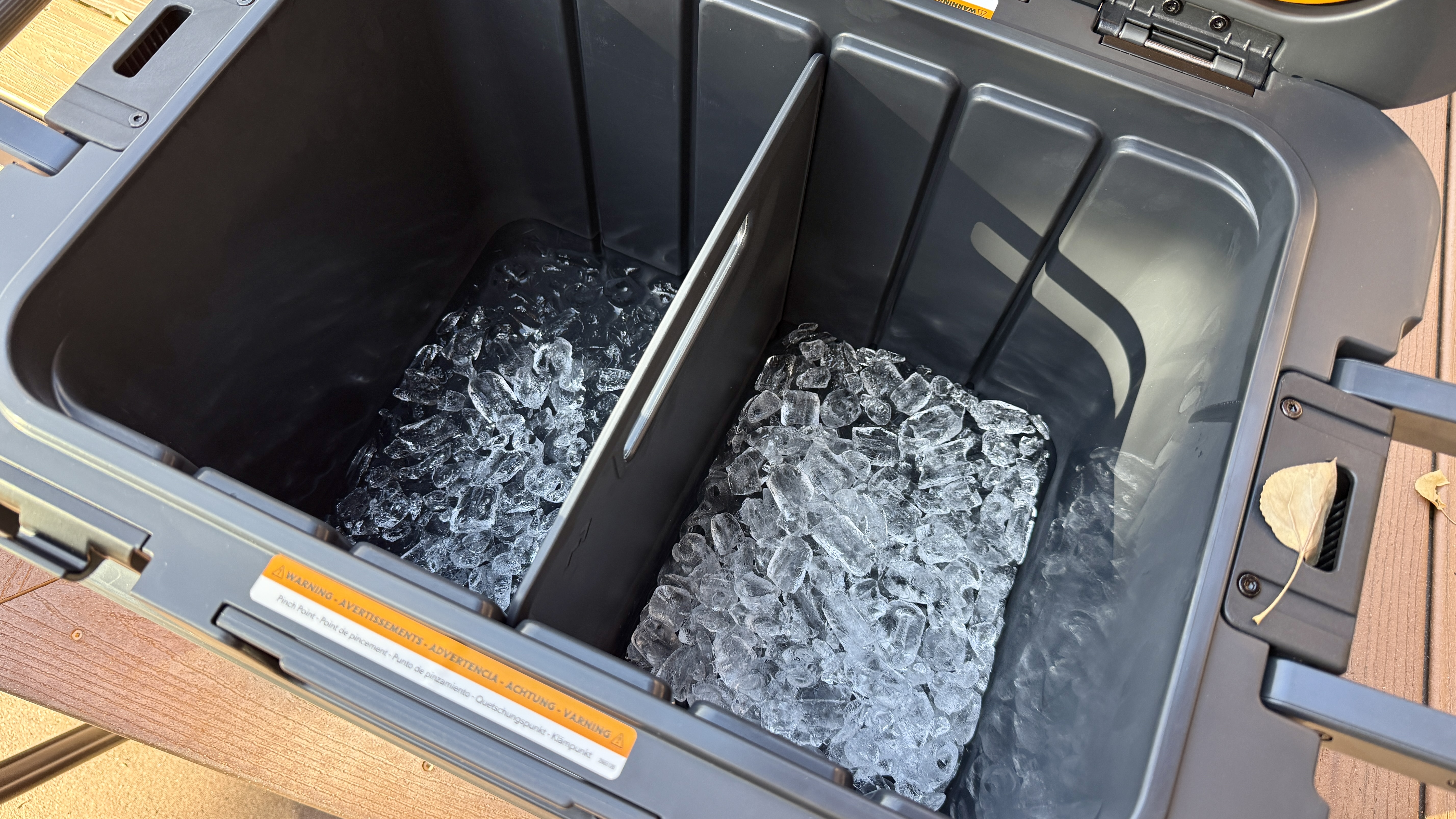 Inside, a removable divider splits the 41L interior into two sections, so you can separate food from drinks or dry goods from ice. I often shifted it around depending on the trip and appreciated the flexibility. Dometic also includes a small plastic basket that suspends above the ice. This is a small detail, but one I really love since I hate bruised fruit, squashed cheese, or cucumbers swimming in water.