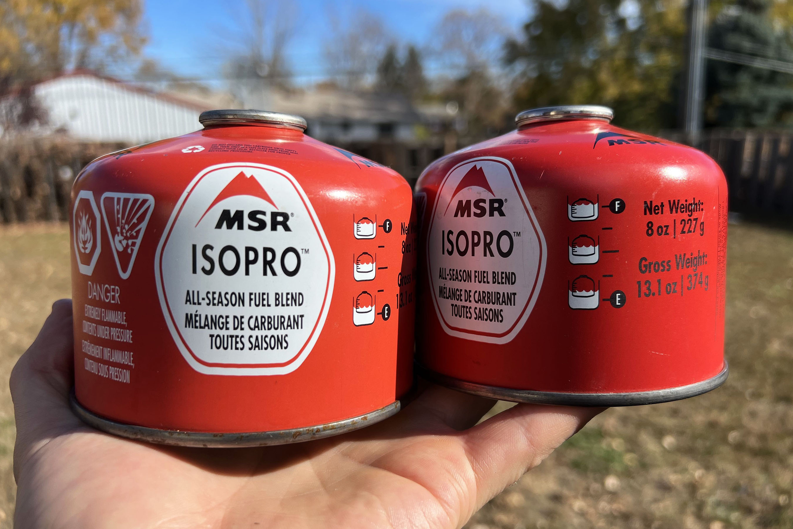 The bottom one should be noticeably heavier than the top one, which should be empty at this point. Now, here’s the tricky part. The brand cautions users not to overfill fuel canisters. But there’s no reliable way to gauge exactly how full a canister is.