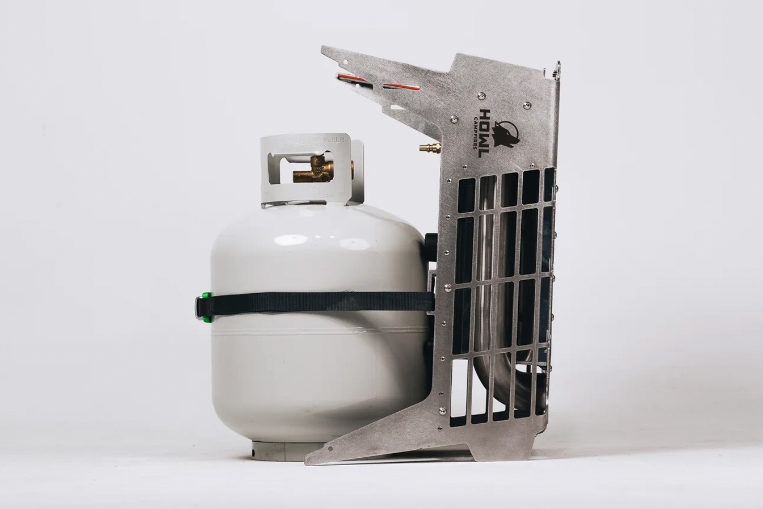 But Howl Campfires got clever. The pitbull-esque R4 can stand vertically on an end, and the legs will straddle a 20-pound propane tank secured by an included strap. Then, slots in the exoskeleton made tying down the package easy and super secure. This proved rock solid in the back of my Subaru or van, and it took roughly the space of two bundles of wood.
