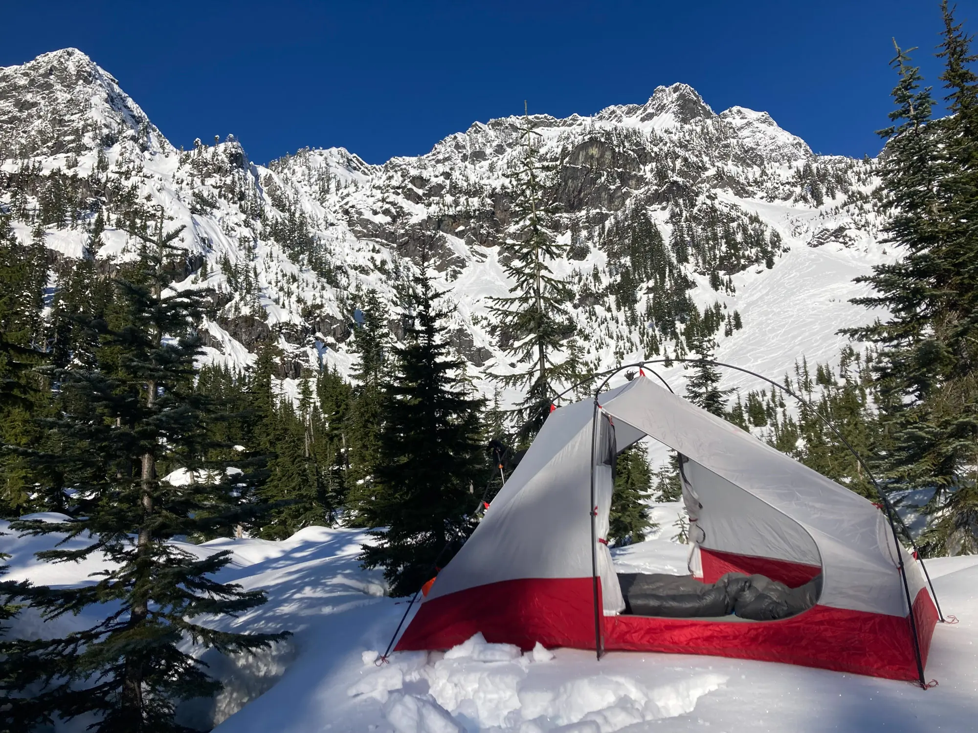 I tested this tent at the base of Bryant Peak in the heart of the Cascade Mountains in Washington. The weather was mild, surprisingly warm for this time of year, and one of the biggest challenges I faced was staying dry from all the wet, slushy snow. I immediately loved how easy the tent was to set up, how light it was, and how versatile it felt.