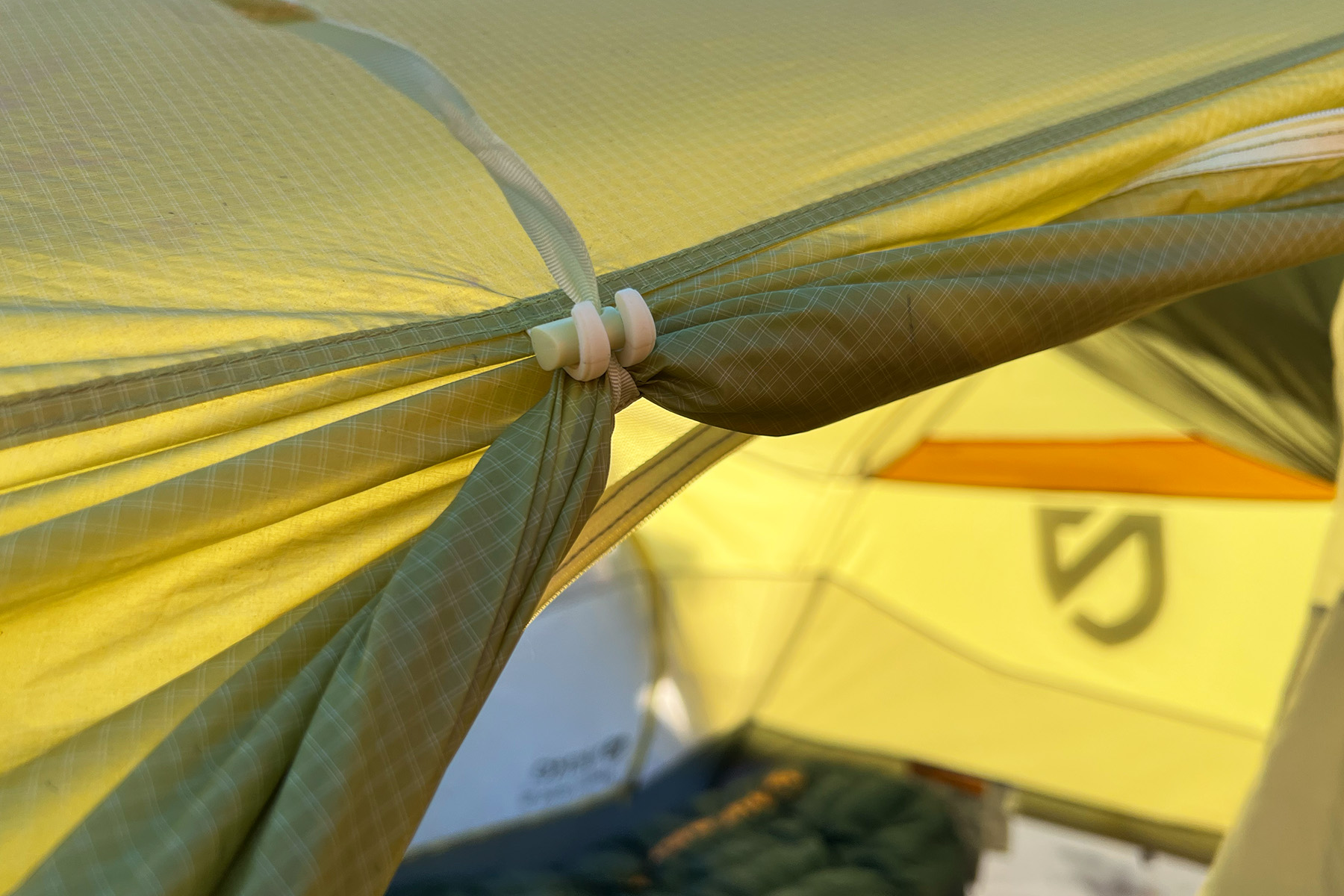 The internal pockets are laid out at points inside the tent where they’re easy to reach when you’re lying down. There is even an opaque honey-yellow pocket on either side of the tent, so when you put your headlamp in it at night, it not only disperses the light but also gives it a gentle, warm hue. Both the doors of the rainfly and of the mesh inner roll up and are secured in place with a cradle hook that holds a cinch button (pictured).