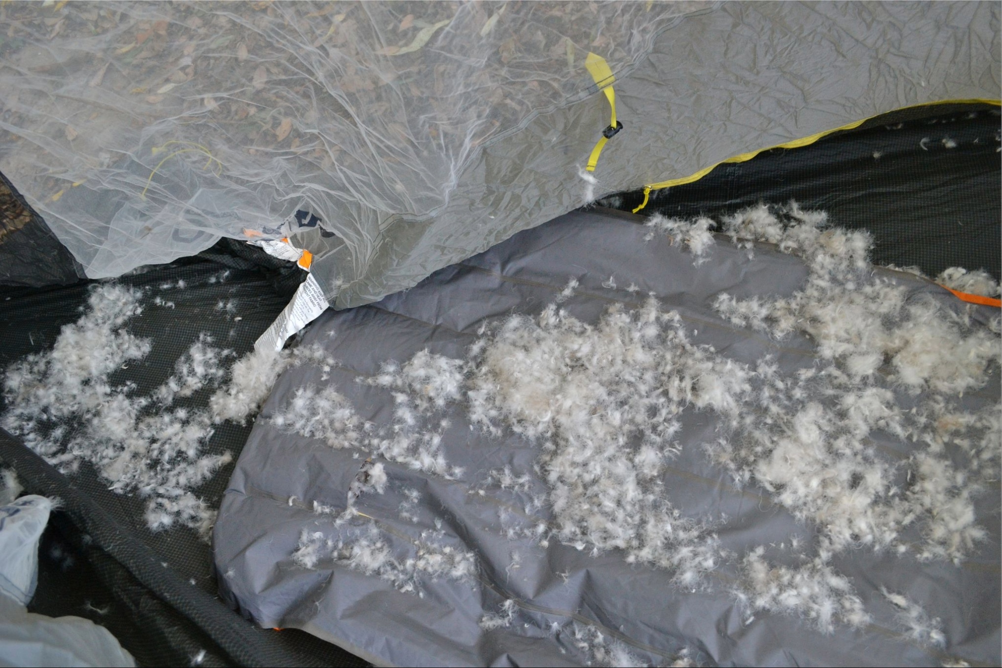 I had set my tent up on soft grass and inflated the Rab pad. I felt around on the ground to make sure that there wasn’t anything sharp or pointy. I got everything settled and slipped into my sleeping bag, cozy and ready to sleep. As soon as I lay down, I heard a loud, distinct “pop!” Immediately, down feathers filled the tent and began swirling around. I looked and saw a large rip in the pad.