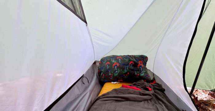 Inside the X-Mid 1 Solid, there’s plenty of room on the ground, but there isn’t a lot of headroom or space to move around. You’ll be able to sit up or roll over, but there’s no room for ballroom dancing. And that’s what you want in the winter. The less space to keep warm inside, the better.