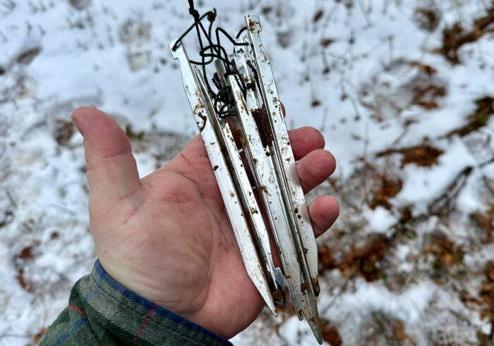 It snowed, then there was an ice storm, and then it snowed again — and then there was a day of rain. Finally, on the last day, it warmed up and the sun made a quick appearance. So, I was able to take the tent down, shake it off, and begin the process of drying it out.