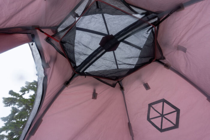 Speaking of storage, twin wall pockets stretch the entire length of a panel. But the real impressive storage lies overhead. Here a removable hexagon-shaped hammock is slung. It hangs beneath a skylight window with twin zippered doors. This portal is covered by the exterior roof cover, and was one of my favorite features in the 2.5. It made the perfect glove- and sock-drying rack.