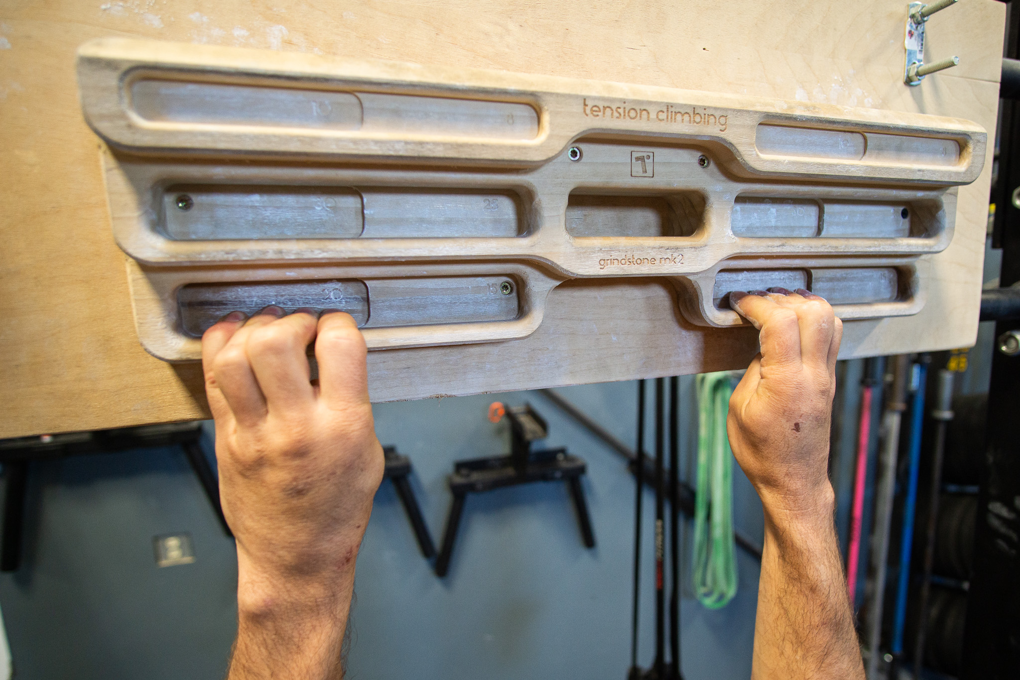 The Tension Block ($54) is probably the least expensive and simplest way to get your fingers in shape. You’l need to find some weight to attach as you progress, but you won’t need to mount a board anywhere in your home. To train the whole chain from fingers to shoulders, you’ll need a full board, and the Metolius Wood Grips II ($90) is the least expensive option.