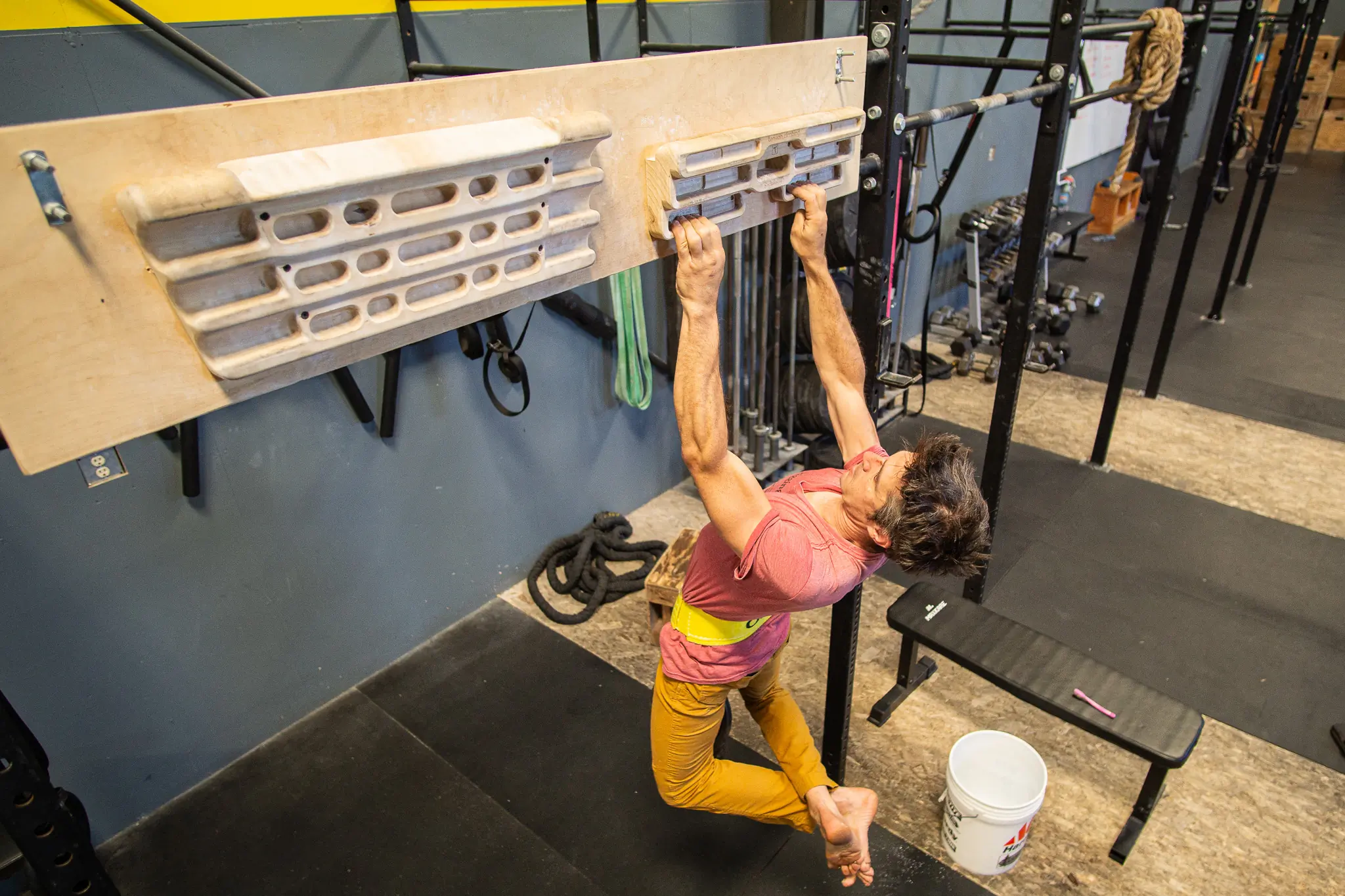 Regardless of your experience level, proper hangboarding technique is very important for injury prevention. Generally, the muscles in the shoulders should not sag and the elbows should be slightly bent to engage the forearms. Keep your back straight rather than arched, especially if you choose to add extra weight to your hang.
