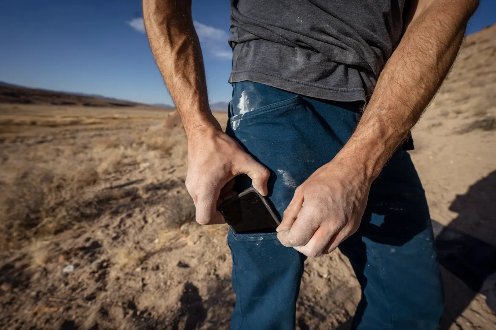 Many climbing pants include thoughtfully placed zippered pockets where a phone or other essential items can be kept safe while climbing. On this list, we love the zippered pockets of the Arc’teryx Gamma for their easy-to-access zippered thigh pocket. It’s out of the way of harness leg loops and large enough to hold most modern phones.