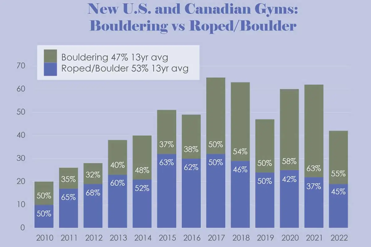However, that also means half of the gym industry retained a focus on the roped climbing disciplines. Half of the 36 new gyms that opened in the U.S. in 2022 included areas for climbing on ropes, including Movement Design District in Dallas and projectROCK Easley in South Carolina.
