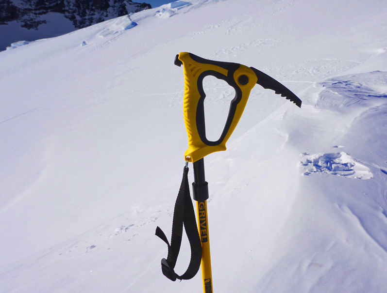 In my left hand is Grivel’s Condor pole, its pick gawking out in front, poised to chomp down on the ice should I fall. Unlike the competition, the Condor’s pick is retractable, folding into a knuckle-guard handle.