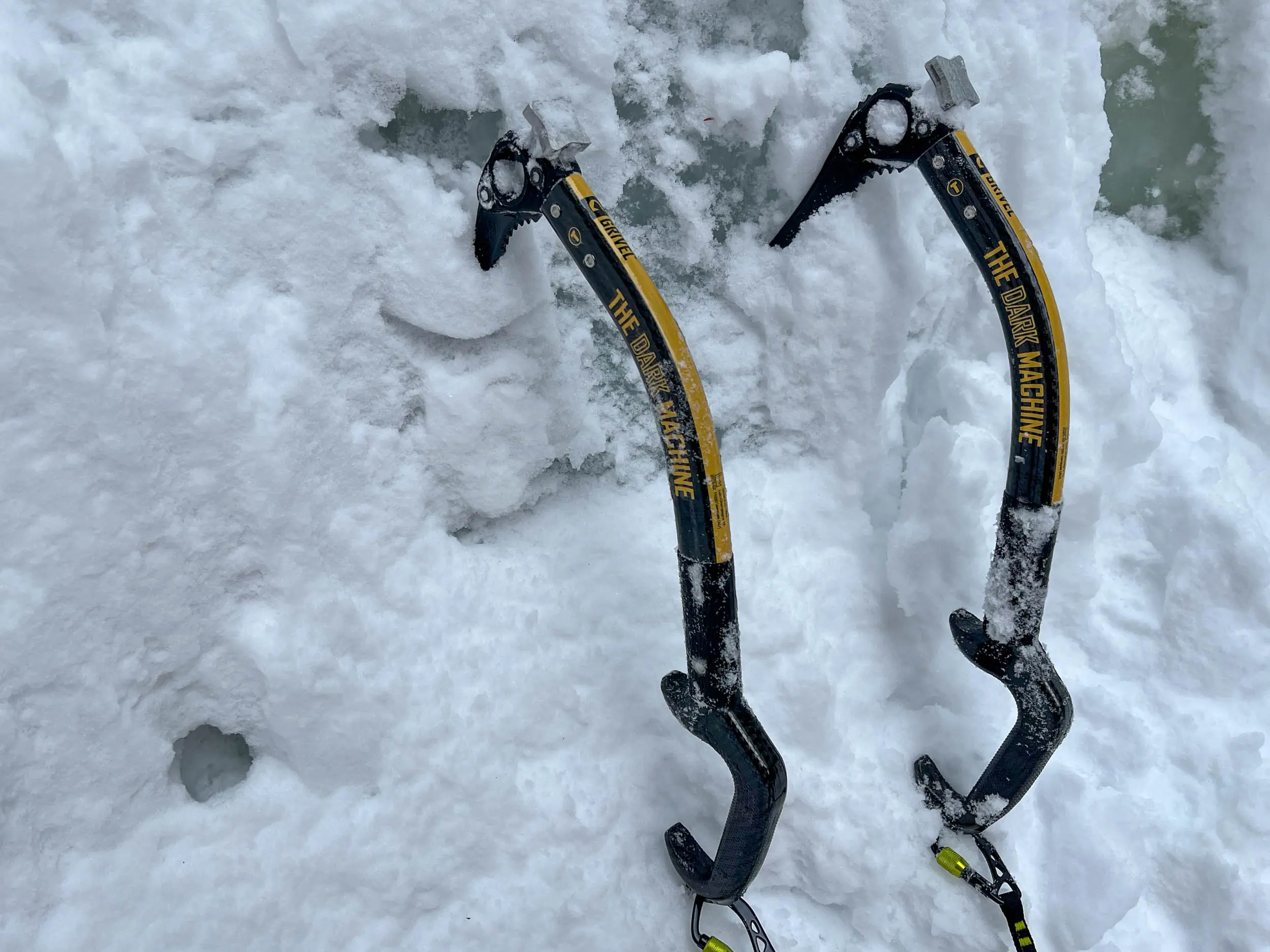 I took the Dark Machines on a warm-up run on a moderate and classic multi-pitch route that varied in grade from WI3 to WI4. I immediately wanted more weight. I felt like I was altering my normal swing due to the very low weight and high balance point. The only description I can make is that on lower-angle ice, I felt like I had to stiffen my wrist more than usual. I couldn’t just let the axe rotate at my wrist, then allow the handle to turn in my hand at the end of the swing. I needed more oomph, which I did with my entire arm.