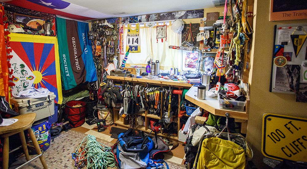 Ice axes, helmets, ropes, and all manner of gear exist in the cave — a basement room adjacent to Anker’s office — alongside expedition maps, old photos, and at least one shrine.