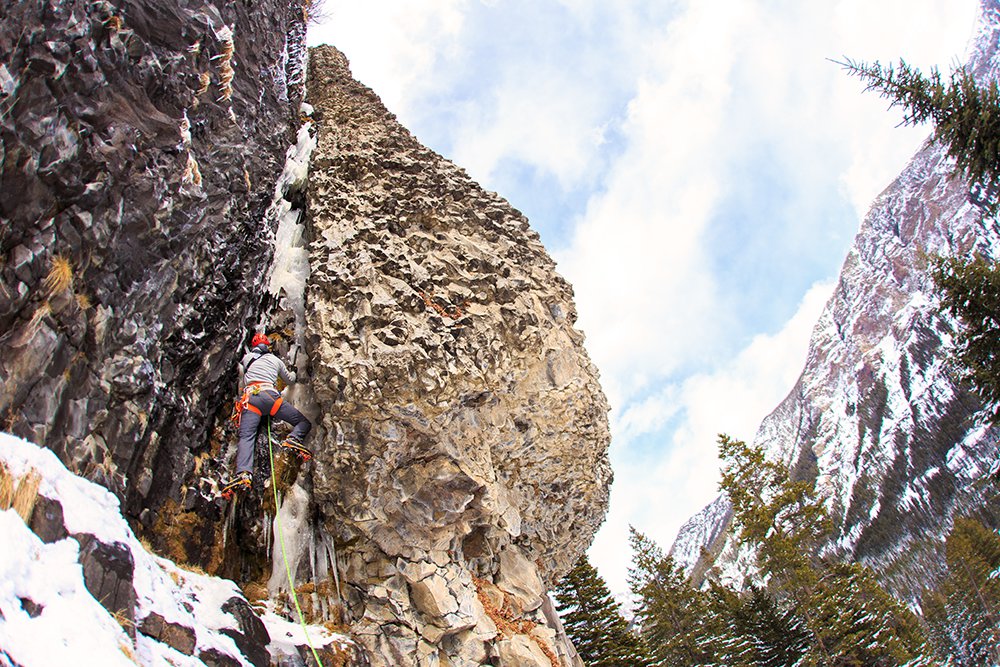 I’m suited up to climb next, all Petzl axes and La Sportiva boots. But currently picking and reaching on the route — an M4/WI4 classic called “The Thrill Is Gone” — is an Anker mentee, Matt Cornell, who lived out of his car for three years before settling in Bozeman to climb ice.