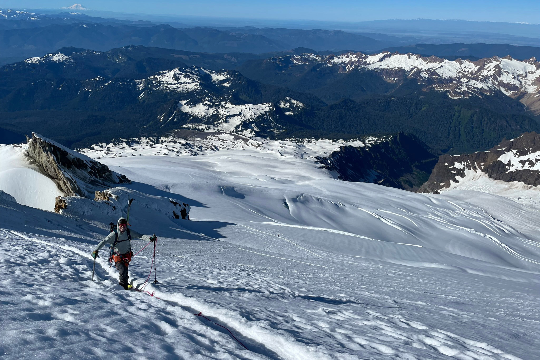 But I took a breath and looked out over the horizon toward the ocean 13,000 feet below me. It was refreshing to take my eyes off my crampon points and the sheer drops on either side. We were still so high up on Mount Rainier, the view of my life lay in front of us. And for a moment, between bouts of exhaustion and anxiety, I felt the intoxication that addicts mountaineers of all levels to the Cascade Range in Washington.
