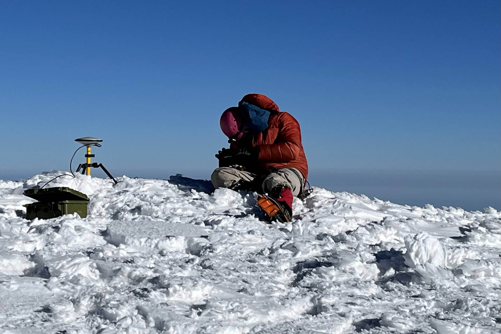 Using about 20 pounds of equipment, Gilbertson will spend up to an hour taking a single measurement using satellite data. Then he takes several more from other points on the mountain. But when he’s finished, his measurement will be accurate to 1 inch.