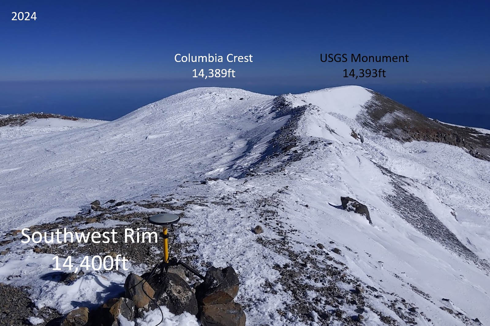 His 2024 attempt was successful, though. When he reached the top, he confirmed his suspicions. The mountain’s summit, known as Columbia Crest, had melted nearly 22 feet since 1998. It was no longer the highest point on the mountain. The new summit location is a rocky point elsewhere on the upper rim, about 500 horizontal feet from Columbia Crest.